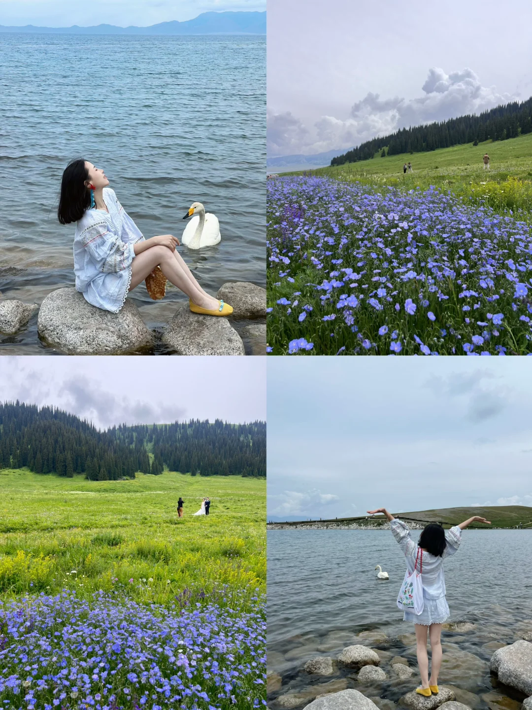 Day6:开车到赛里木湖,一定一定要往前开!一开始天气不好拍了天鹅,没想到我们爬上松树头,天气就好起来了!真的是没白来,天气好真的是太重要了!超级美了,但是山上的花已经没有了哈,然后我们回伊宁的路上还看了果子沟大桥还有晃晃村的薰衣草,挺美的,然后就返程回伊宁啦,我们是坐了火车去了乌鲁木齐(图13~17)