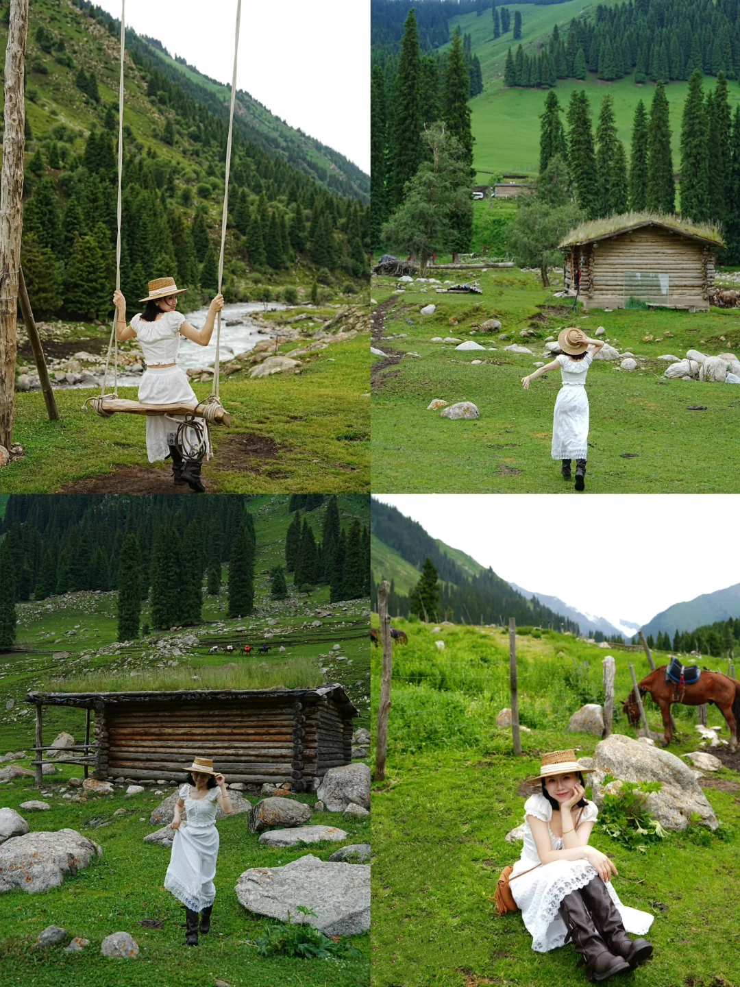 Day3:开车琼库什台,这里很适合爱骑马和徒步的朋友,我不敢骑马,骑马来回是3个多小时,但是我们选择了徒步,没想到来回我们走了5个小时[失望R],我们一直沿路走到了观景台,天气不够好,但是还好风景还可以,然后又从观景台到秋千位置走了半小时,这一小段很不好骑马和徒步(图5~6),拍照倒是挺出片的[捂脸R],真的是很难忘的经历了