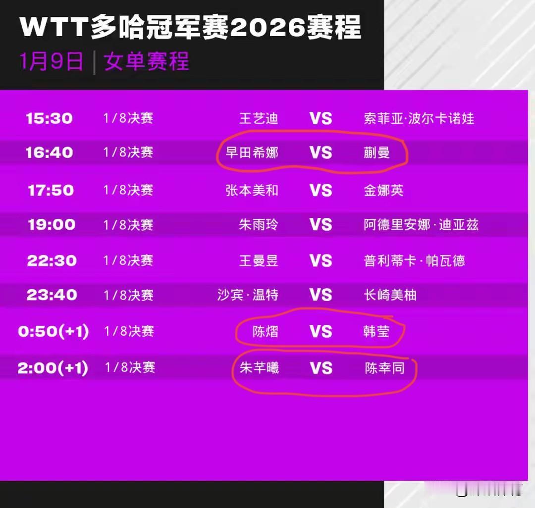 第三比赛日:女乒有3 场“硬仗”谨防爆冷! 国乒女队首轮初战告捷,5 人全部进入16强,到今天开始第二轮,3 人面临硬仗: 蒯曼对早田希娜,从这次比赛来看,早田希娜的状态不错,蒯曼要十二分清醒。 陈熠打韩莹,韩莹是削球手,实力不强,但削球手难打,陈熠以前对削球手胜率并不高。 陈幸同对朱芊曦,朱芊曦最近提升明显,去年底对王曼昱打的有声有色,陈幸同要当心爆冷啊。 而对于曼昱和大迪,我认为压力不大,肯定能顺利晋级。