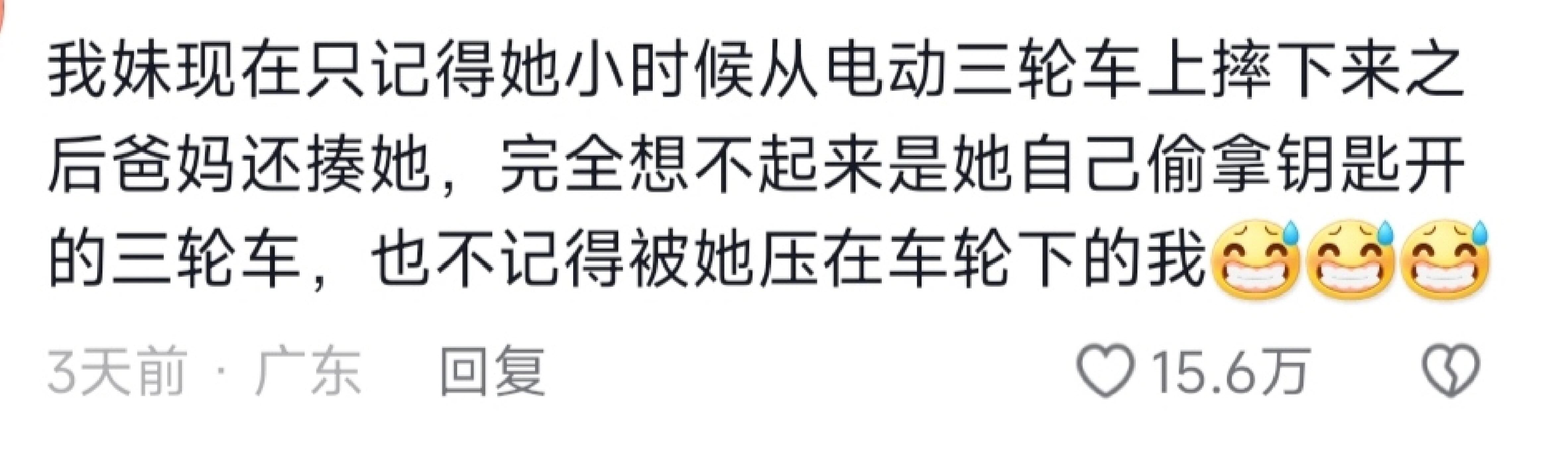 我妹现在只记得她小时候从电动三轮车上摔下来之后爸妈还揍她,完全想不起来是她自己偷拿钥匙开的三轮车,也不记得被她压在车轮下的我""
