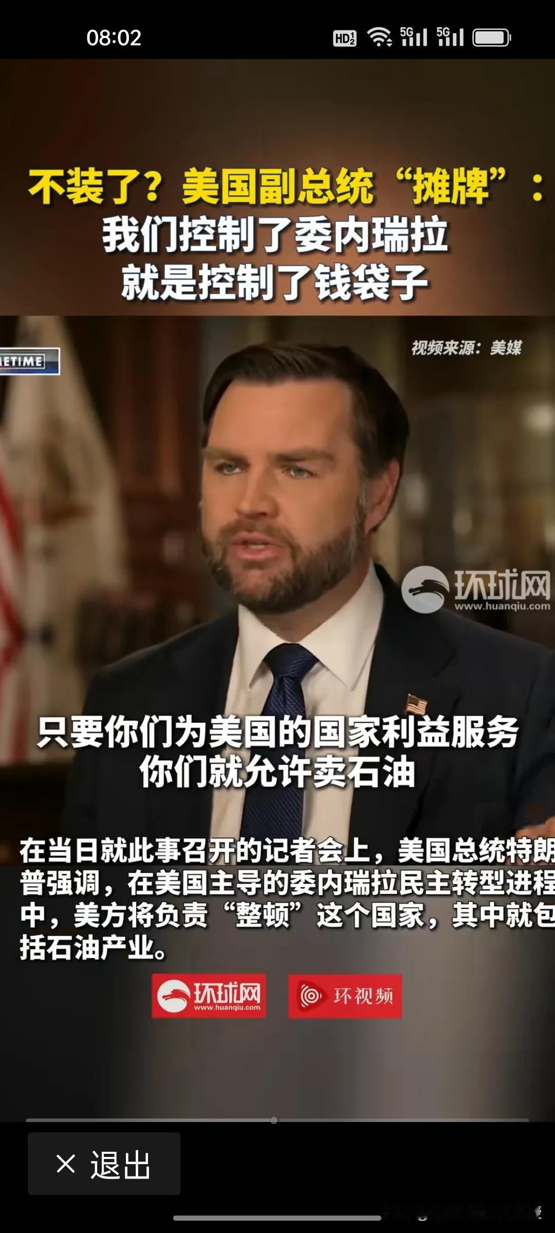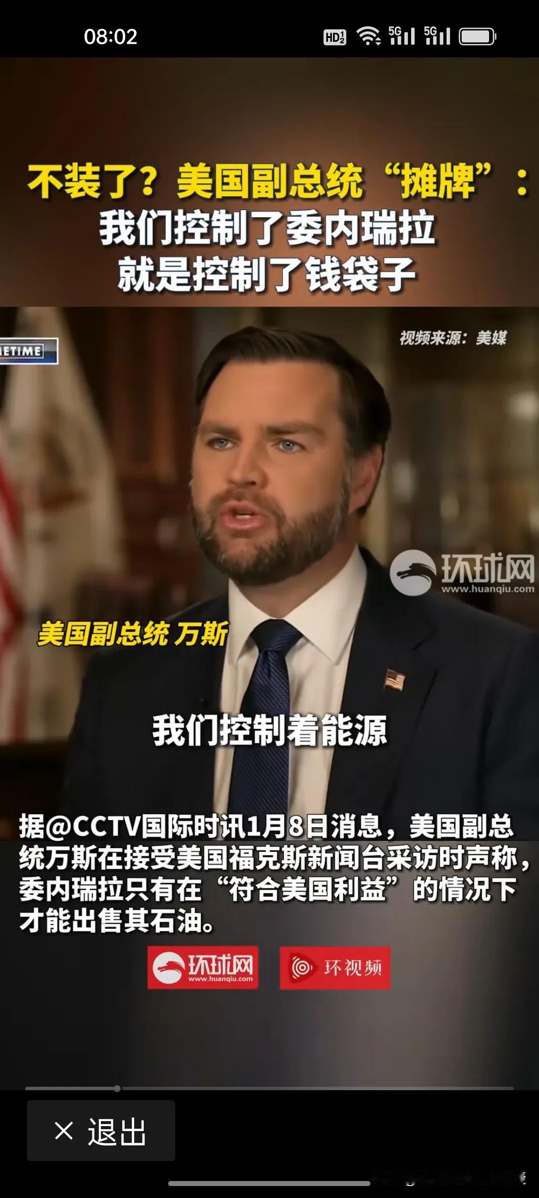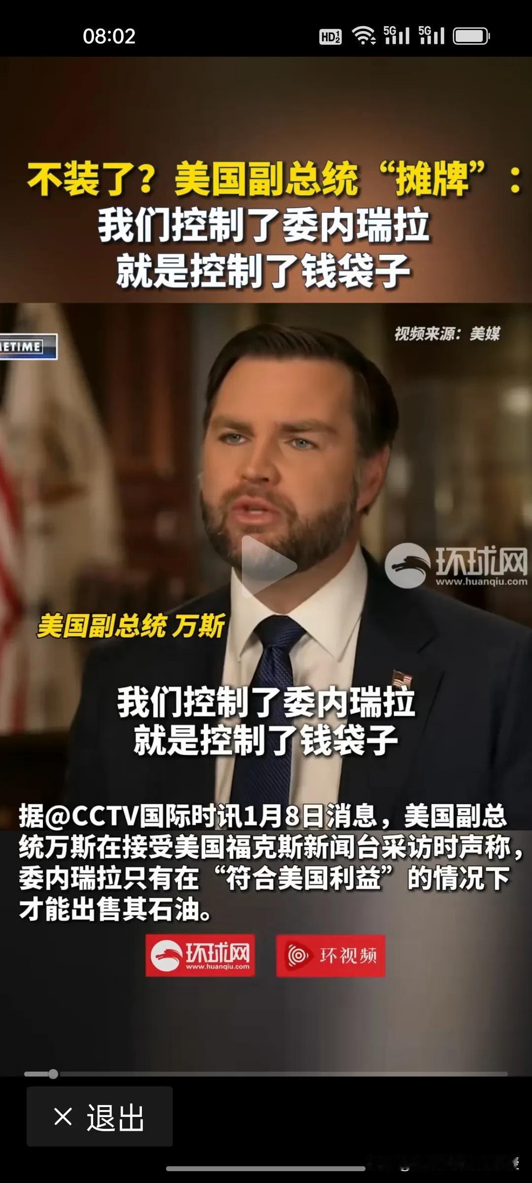 “我们控制了委内瑞拉,就是控制了钱袋子。”万斯说话风格和特朗普一样,就是这么直接。还有国防部长赫格塞思,这三个人的对外输出口径高度统一,装都懒得装,就是打明牌,告诉大家,美国突袭委内瑞拉就是为了石油,就是要在不牺牲美国军人的情况下得到石油,帮美国赚钱。 万斯昨天接受美国福克斯新闻台采访,就是直截了当地“摊牌”了,就是要让委内瑞拉服务于美国,同时要无限期整顿委内瑞拉,包括石油产业,美国在委内瑞拉得到的5000万桶石油卖出去之后钱就打在美国账户,一副“你奈我何”地嚣张气焰跟特朗普如出一辙。