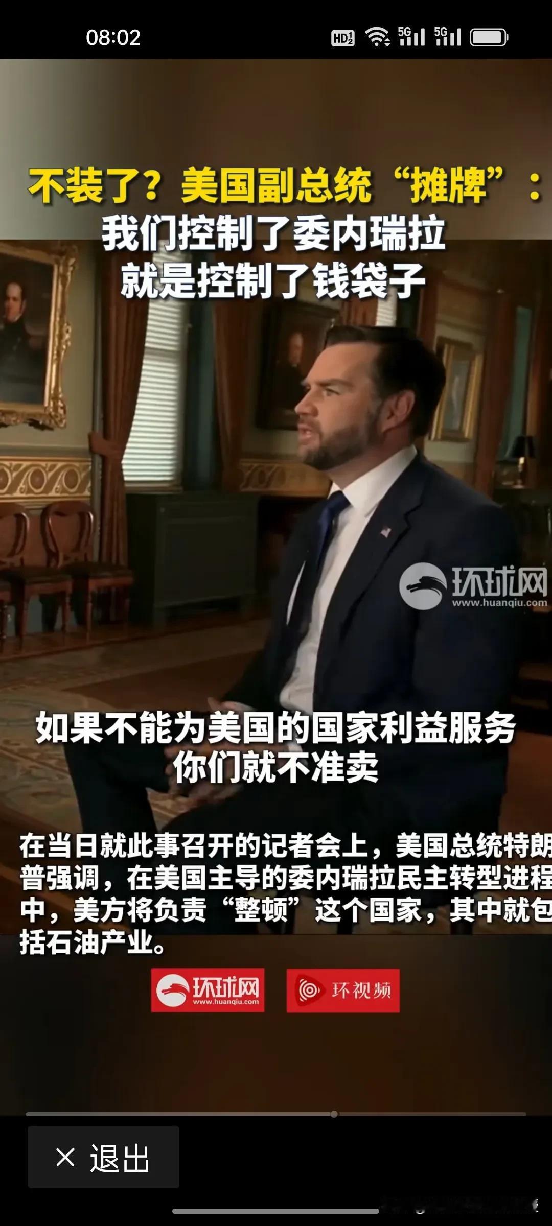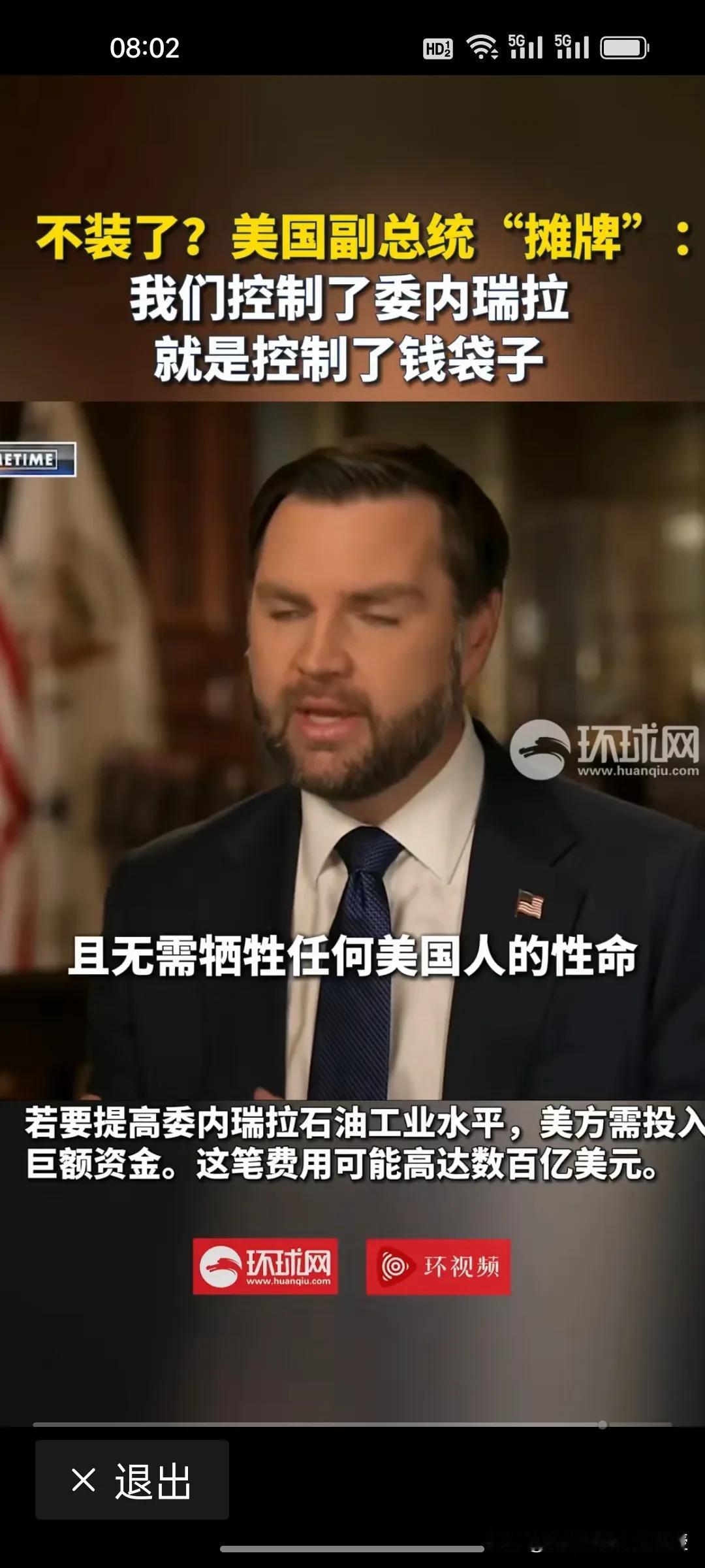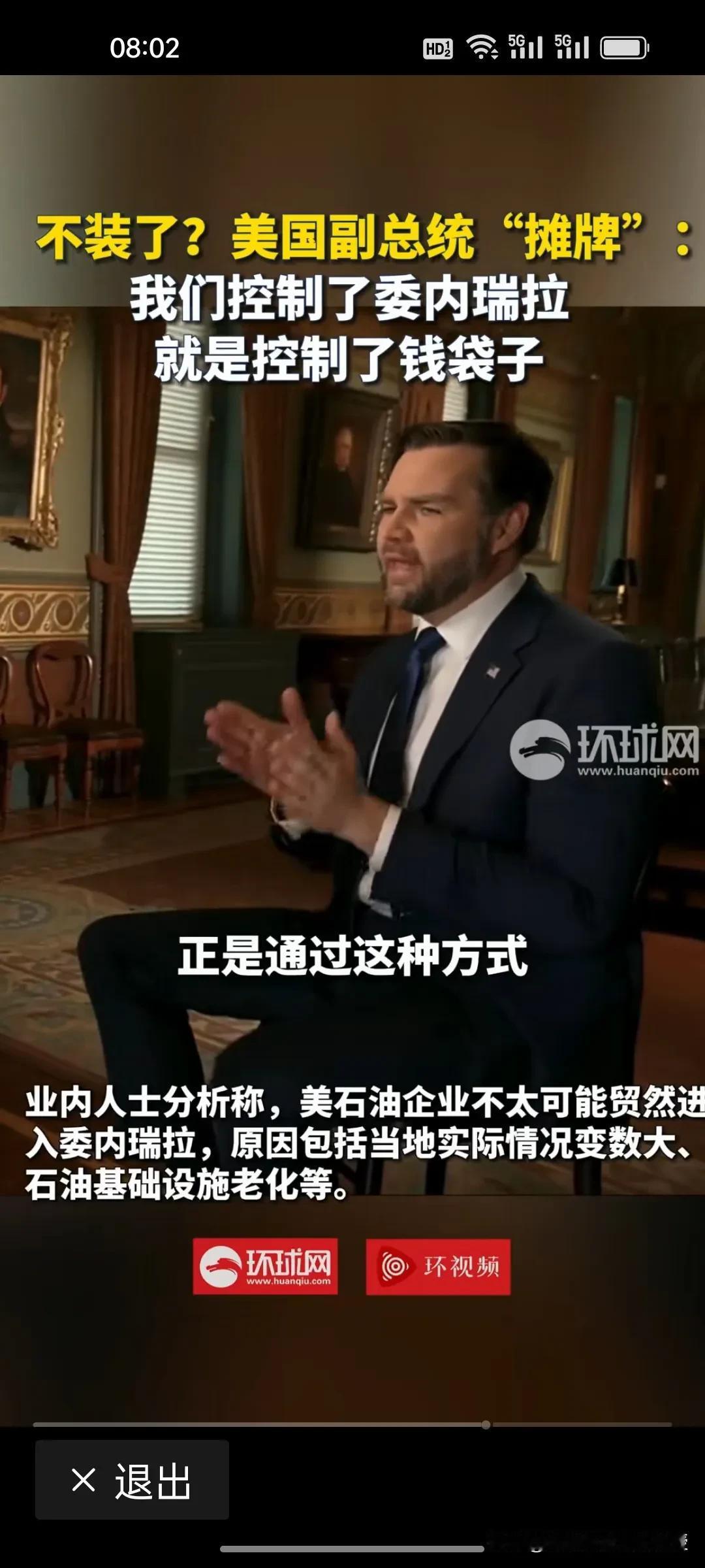 “我们控制了委内瑞拉,就是控制了钱袋子。”万斯说话风格和特朗普一样,就是这么直接。还有国防部长赫格塞思,这三个人的对外输出口径高度统一,装都懒得装,就是打明牌,告诉大家,美国突袭委内瑞拉就是为了石油,就是要在不牺牲美国军人的情况下得到石油,帮美国赚钱。 万斯昨天接受美国福克斯新闻台采访,就是直截了当地“摊牌”了,就是要让委内瑞拉服务于美国,同时要无限期整顿委内瑞拉,包括石油产业,美国在委内瑞拉得到的5000万桶石油卖出去之后钱就打在美国账户,一副“你奈我何”地嚣张气焰跟特朗普如出一辙。