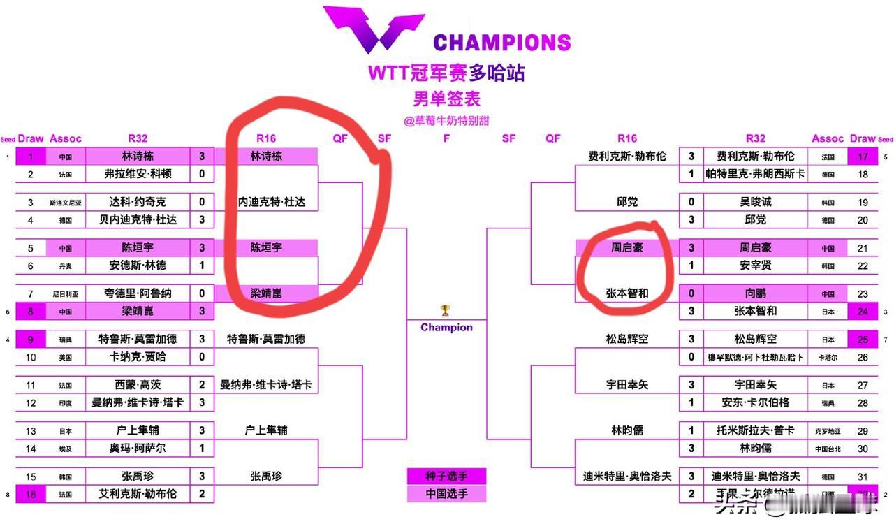向鹏打张本不行:周启豪该你上了💪 果然啊,向鹏还是没有给我们惊喜,0-3 输给了张本智和,输得很干脆,说实话,这场比赛,向鹏没有还手之力。 周启豪首轮展现出了不错的状态,希望次轮对张本智和,能拿出超绝状态,拿下张本智和。 而在另外半区,次轮开始,国乒开始“内战”了,陈垣宇梁靖崑相互“厮杀”,胜者下一轮再和林诗栋“厮杀”,这意味着三人只有一人可以进入 4 强。 这次签位,确实够劲啊