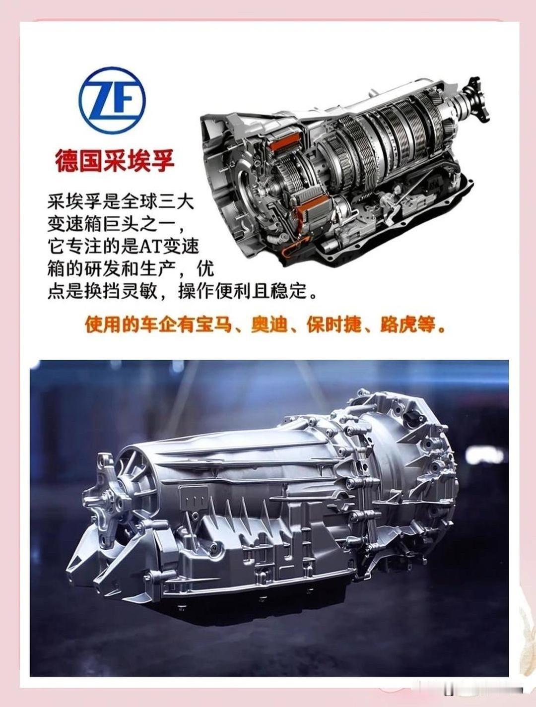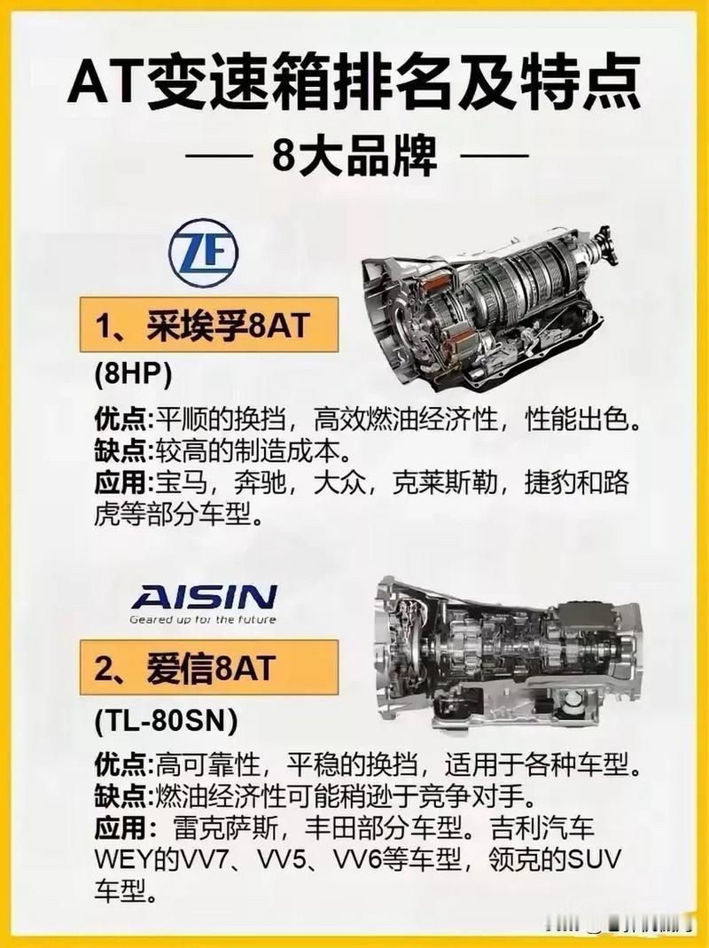 为什么全世界只有中国人觉得宝马的变速箱是最好的,因为有些技术车企是故意隐瞒了咱们。 你肯定见过不少车企都把8AT当王牌吹,但你不知道的是,这玩意儿水可深了!同样是8AT,不同牌子的差距,那简直是天差地别! 先说公认的天花板——采埃孚8AT,一众豪车都是它的忠实粉丝,宝马全系,奥迪的豪华高性能车等等全搭载着这款变速箱。靠着5个离合器+4组行星齿轮的硬核构造,换挡快到没朋友,还贼平顺。齿比跨度超大,一脚油能爆发超强推背感,日常开又省油。 那这采埃孚8AT变速箱这么强为啥有的燃油车都不屑看它一眼? 主要是因为它有俩硬伤:一是贵,批量拿货都要1.2万;二是只适配纵置发动机,占空间,家用车根本装不下。 那家用车的8AT“扛把子”是谁? 必须是爱信8AT!沃尔沃、丰田高端款、还有不少国产品牌都爱用它。它是在成熟的6AT上升级来的,齿比调的合理,平顺省油还不占地儿。但它也有个小毛病:二挡升三挡时行星齿轮架会反转,低速换挡偶尔会顿挫一下。 最后给你划重点!没有绝对的好8AT,只有适合自己的。性能控选采埃孚准没错,家用党选爱信更务实。买车前看准变速箱型号,才不会踩坑! 文 张国成