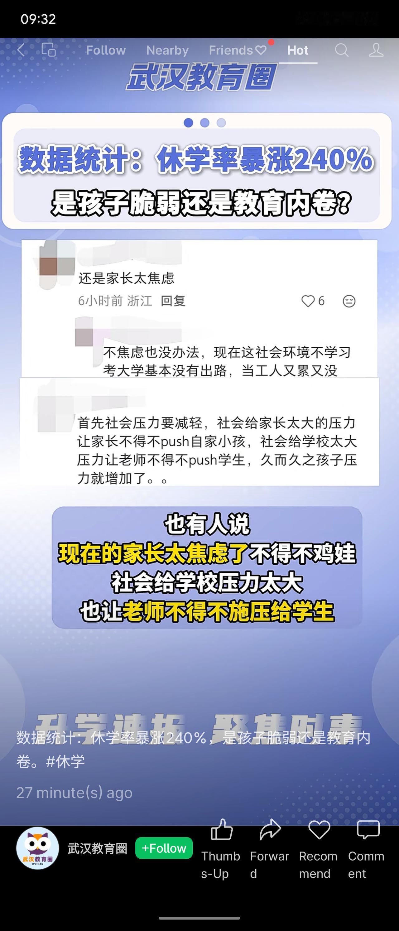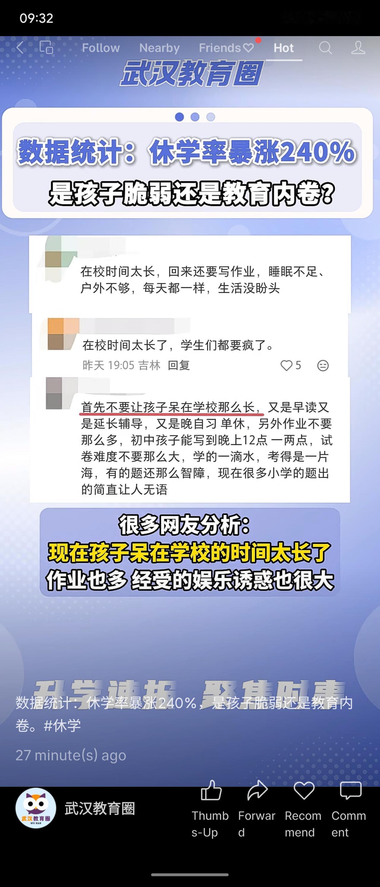 数据显示,中小学生休学率同比增长240%,其中67%与情绪障碍相关。网友普遍认为主因在于学业压力过大、在校时间过长及课后服务挤压休息。争议焦点在于:是教育内卷导致系统压力,还是家庭与社会焦虑传导至学生。
