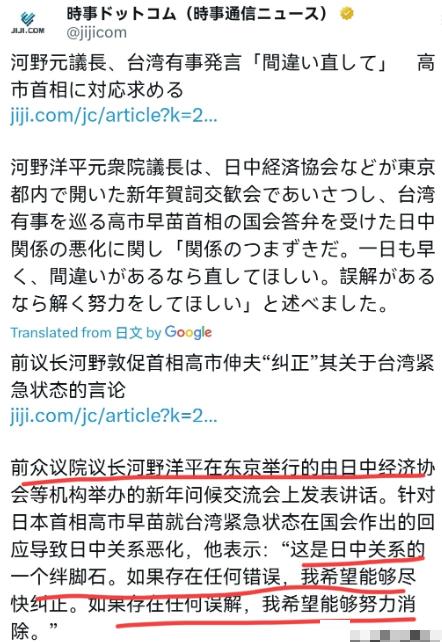 事态严重了!日本政坛大佬,资深政治家河野洋平公开出来对高市早苗施压了!   1月7日,根据日媒报道,年届快90岁的前日本众议院议长河野洋平在新年问候交流会时表示,日本首相高市早苗在国会就台湾紧急状态发表的言论导致日中关系恶化,这是日中关系的一个绊脚石。   要我说,河野洋平这次施压绝不是一时冲动。作为在日本政坛摸爬滚打几十年的老资格,他当过自民党总裁、副首相兼外务大臣这些关键职位,更因为1993年发表正视“慰安妇”问题的“河野谈话”,成了日本理性外交派的代表人物。   他的话在日本政界和商界向来分量极重,相当于一个“风向标”。这次特意选在日中经济协会等机构参与的新年贺词交流会上说这话,明摆着就是盯上了高市早苗涉台言论的破坏力——尤其是对日本商界实实在在的利益冲击。   高市早苗之前在国会的涉台发言,可不是简单的“说错话”那么简单。去年11月7日,她在国会答问时,公然放话:如果中国大陆对台湾出动军舰、使用武力,那可能就构成日本能行使集体自卫权的“存亡危机事态”。   这话一出口,直接打破了历届日本政府在台湾问题上小心翼翼的表态惯例。   要知道,台湾问题是中国的核心利益,中方反应特别迅速且强烈。外交部副部长孙卫东、驻日大使吴江浩接连紧急召见日方官员提抗议,明确指出她这话严重违背一个中国原则和中日四个政治文件的精神,把中日关系的政治基础都给破坏了。   之后中国外交部和驻日使馆还发布了中国公民赴日安全提醒,好几家航空公司紧跟着推出了日本航线客票免费退改的政策。   截止到去年11月24日,已经有12条中日航线取消了所有航班,人员往来一下子冷了下来,直接砸中了日本旅游业这些靠中国市场吃饭的产业。   河野洋平特意强调,高市早苗的话让人觉得《日中联合声明》的原则被否定了。   1972年签署的这份声明里,日本明确写着“充分理解和尊重”中国关于台湾是中国领土不可分割一部分的立场。正是靠着这份声明的精神,中日关系才顺顺利利发展了几十年。   更关键的是,高市早苗的话不光让中方强硬反制,在日本国内也炸了锅。去年11月15日,上百名日本民众直接跑到首相官邸前集会抗议,喊着“撤回发言,赶快道歉”“高市下台”的口号。   之后东京、冲绳、熊本这些地方,接连出现抗议活动,这么大规模的抗议可不多见。这明明白白能看出来,日本民众怕啊——怕她的话把日本拖进战争风险里,心里又焦虑又愤怒。   日本社会民主党党首福岛瑞穗更直接,说高市早苗把“台湾有事”当成“存亡危机事态”完全没道理,只会让冲绳这些西南诸岛变成战争前线。   经济上的冲击,更是让日本商界坐不住了——这也是河野洋平特意选在经济界相关交流会上施压的核心原因。   今年1月3日共同社发了个调查数据,他们问了114家日本运输、零售、能源、电气这些行业的企业,结果54家企业明确说,中日关系紧张对自己的业务有影响,要么影响大要么影响小,差不多占了一半。觉得没影响或者几乎没影响的,只有13家。   问到如果中日关系再恶化最担心啥,33%的企业怕在华的产品和服务卖不动、销售额下降;26%的企业担心在华的工厂、店铺、办事处没法正常运营;还有23%的企业直说了,因为中国旅行团取消赴日旅游,担心自己的销售额下降。   更值得注意的是,以前中国驻日大使出席日中经济新年会是老规矩,但2026年1月7日这次吴江浩大使没去。这种少见的情况,被日媒解读成是受中日关系紧张的影响,也从侧面印证了高市早苗的言论,把中日官方和民间的交流都给堵住了。   河野洋平在致辞里明明白白敦促高市早苗赶紧采取措施,包括修正涉台言论,还说“要是表述错了,就尽快改;要是有误解,就赶紧想办法化解”。他这话背后,其实是日本理性派力量对当前外交困局的焦虑。   但高市早苗一直是右翼立场,她之前还说过“九·一八事变”后日本对外侵略是“自卫战争”,还反对纠正甲级战犯分祀的相关措施。这次的涉台言论,不过是她右翼外交理念的延续。   河野洋平这次都快90岁了还出山发声,本质上就是想靠自己的政治威望,牵制住高市早苗的激进外交路线,别让中日关系滑到没法挽回的地步。   毕竟对靠对外经济吃饭的日本来说,稳定的中日关系从来不是“可选项”,而是关系到老百姓生活和经济发展的“必选项”。