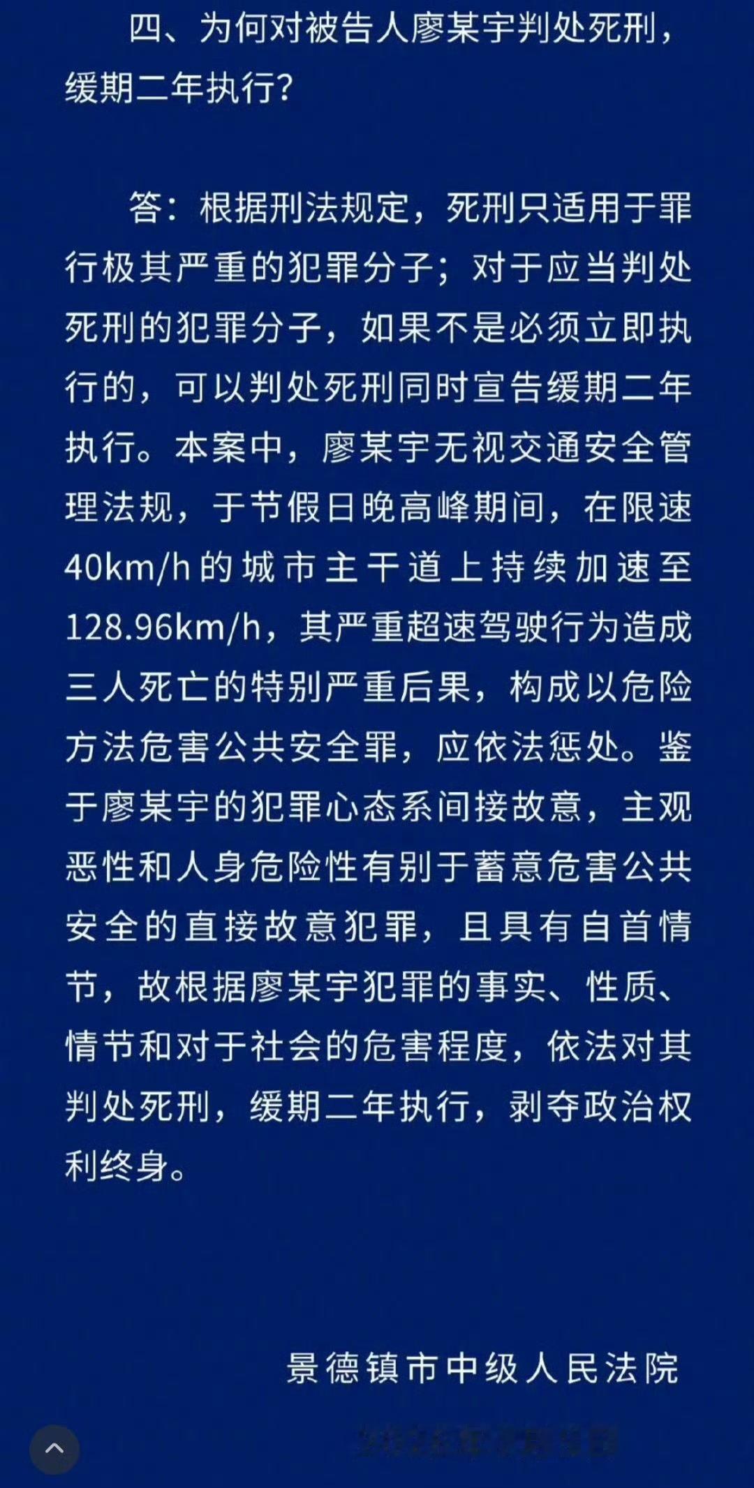 景德镇那位超高速度撞死一家三口的廖某被判死缓,受害者家属表态一定会上诉,支持受害者家属上诉,因为太惨了。 豆包帮忙查了一下死缓犯罪出狱时间,最快的情况为15年,还有不少于二十年和二十五年情况的。 每一个人的生命价值都应该受到尊重,对那种漠视他人生命价值的傲慢群体,让他们付出应有的代价是最好的结果。 江西撞死三人案