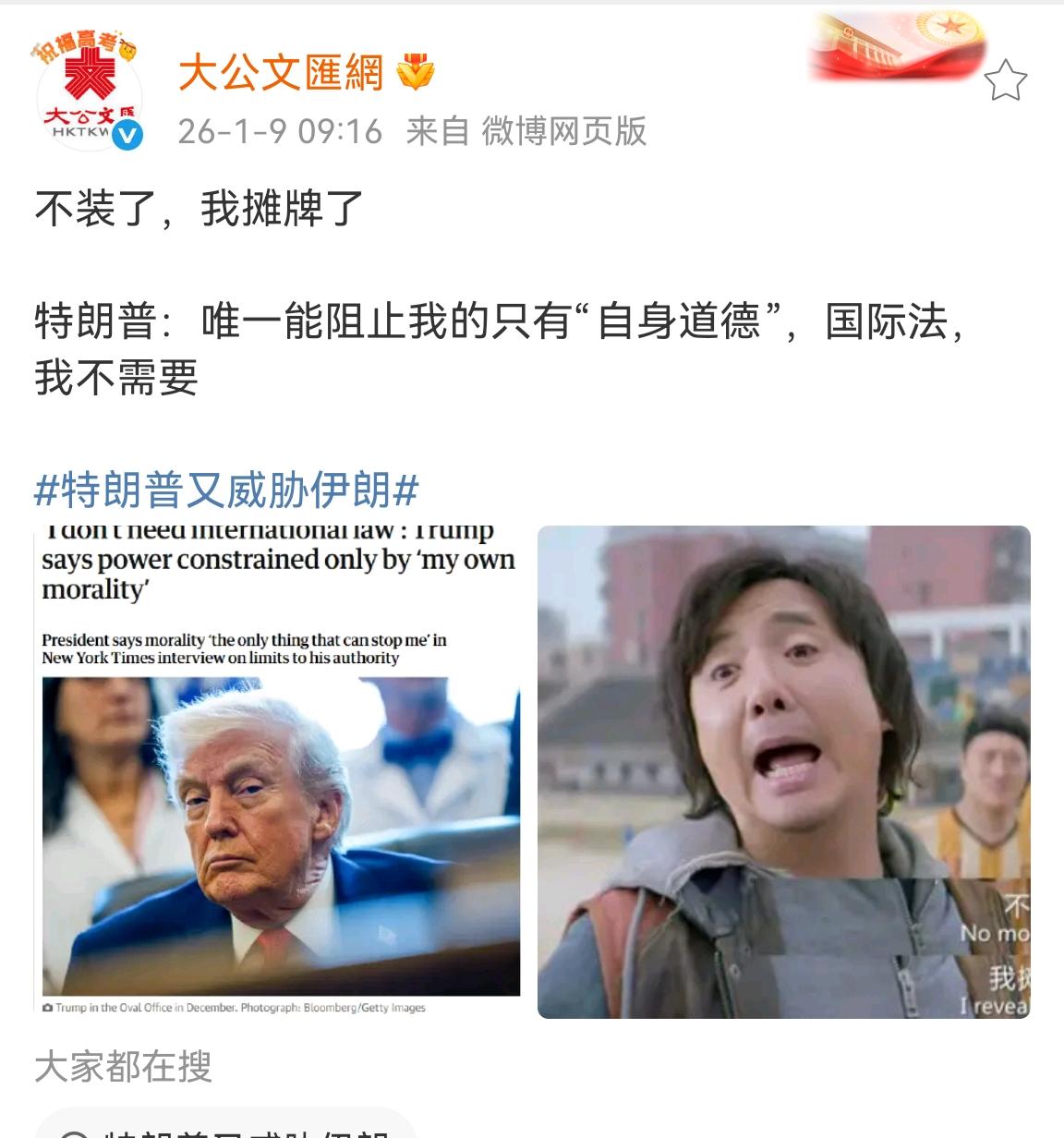 特朗普表示他不需要国际法,因为他有软肋。 当特朗普对媒体公开他对权力使用的限制软肋时,全世界都表示等于权力没有限制。 特朗普堪称全世界最任性的领导人,即使充满霸权氛围的美利坚,也从来没有出现过这样连借口都懒得找的总统。 现在的问题是国际法,他不需要。而能限制他的“自身道德”大家又严重怀疑有多少。 这…可真是一个难题…[捂脸][捂脸]