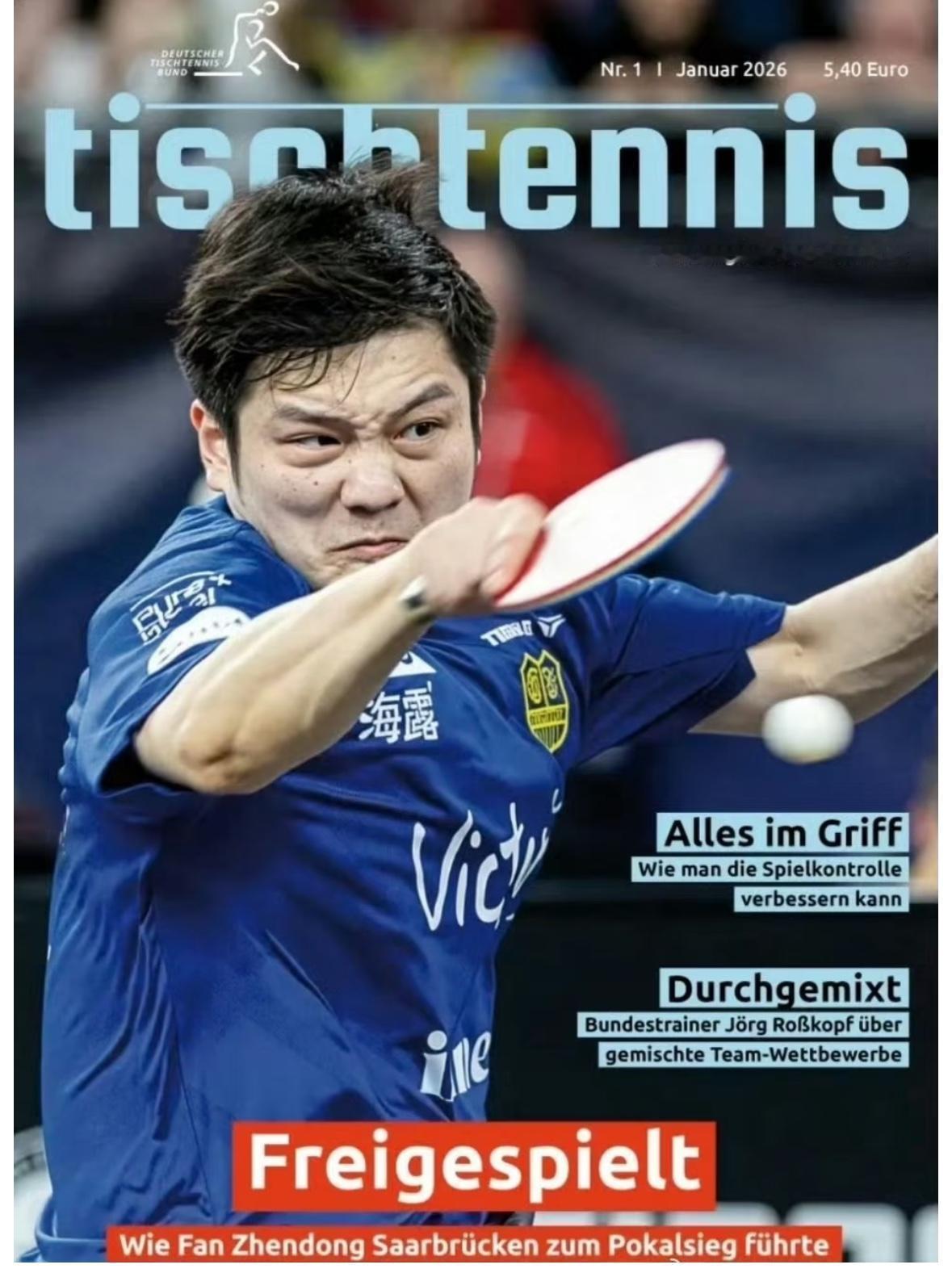 樊振东登上德国乒乓球杂志封面一月刊 樊振东在赛场上全力拼搏, 紧咬牙关,眉头紧锁, 目光凌厉,面部肌肉紧绷, 所有情绪都被压缩在那一瞬间的专注里, 脸上写满了“我不能输”! 这样的表情真的看一次就被震慑, 尤其是那两道眉和鹰眼! 太有血性! 这样的面部表情展现了樊振东 奋力拼搏,全力以赴, 必胜的决心, 展现了竞技体育的魅力美感! 他们更喜欢运动员力量感的击球瞬间,而不是樊振东的白幼萌!