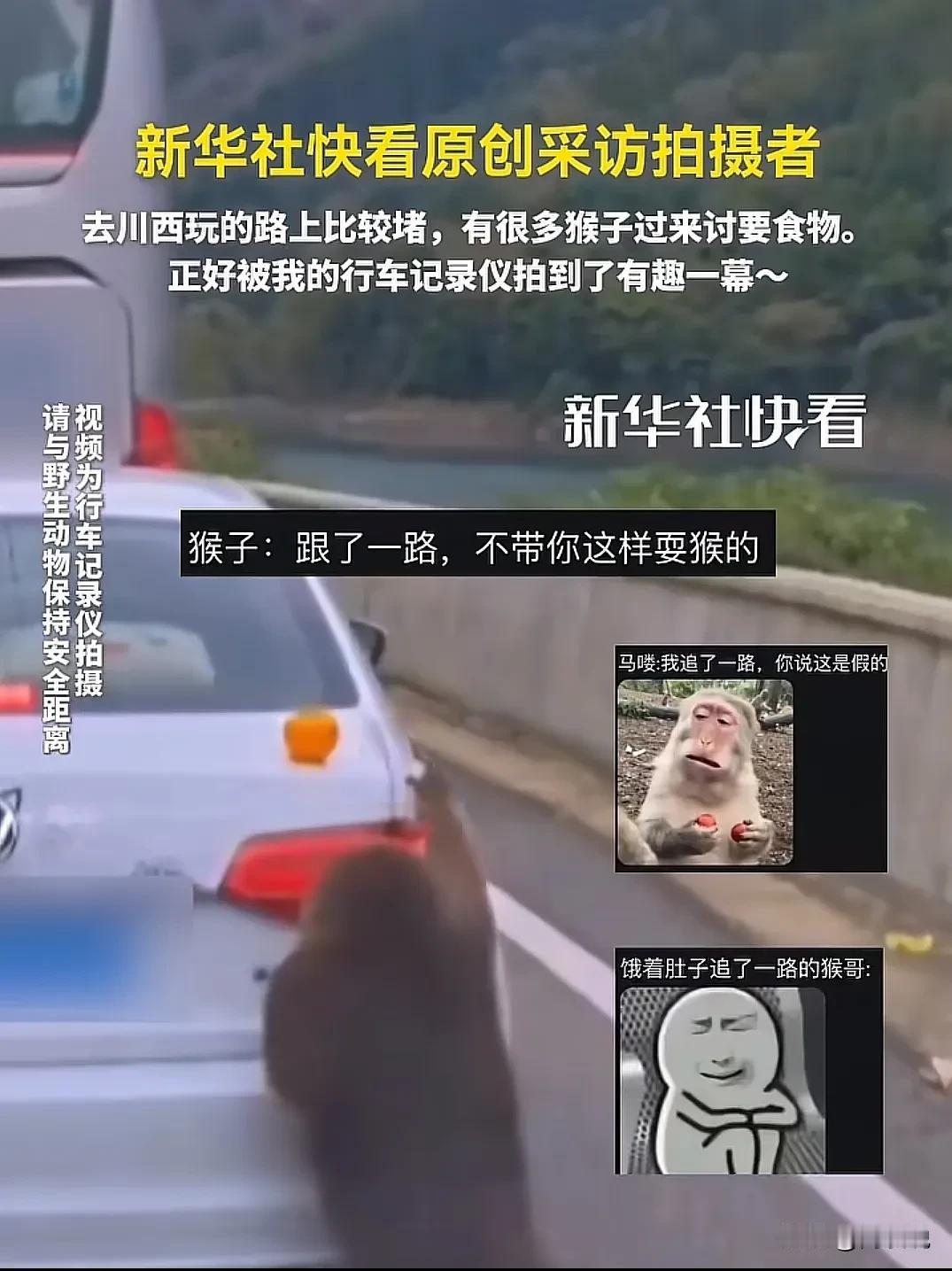 “笑不活了!”四川,一只猴子趁马路堵车时,突然跑过来讨要食物,它看见车后面有一个