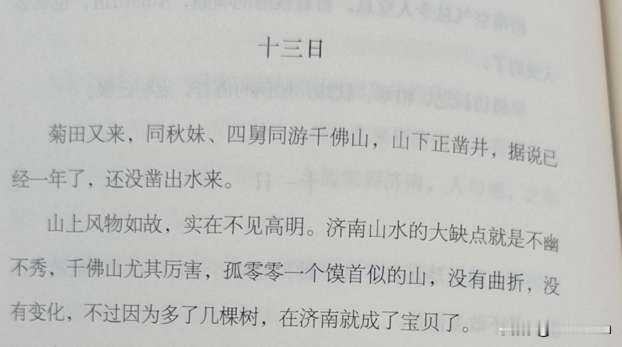 看季老先生的《清华园日记》,感觉他并不太喜欢济南,他说济南山水的大缺点就是不幽不秀,千佛山尤其厉害。 他写这日记是1933年,现在的千佛山应该跟那时的不一样吧。