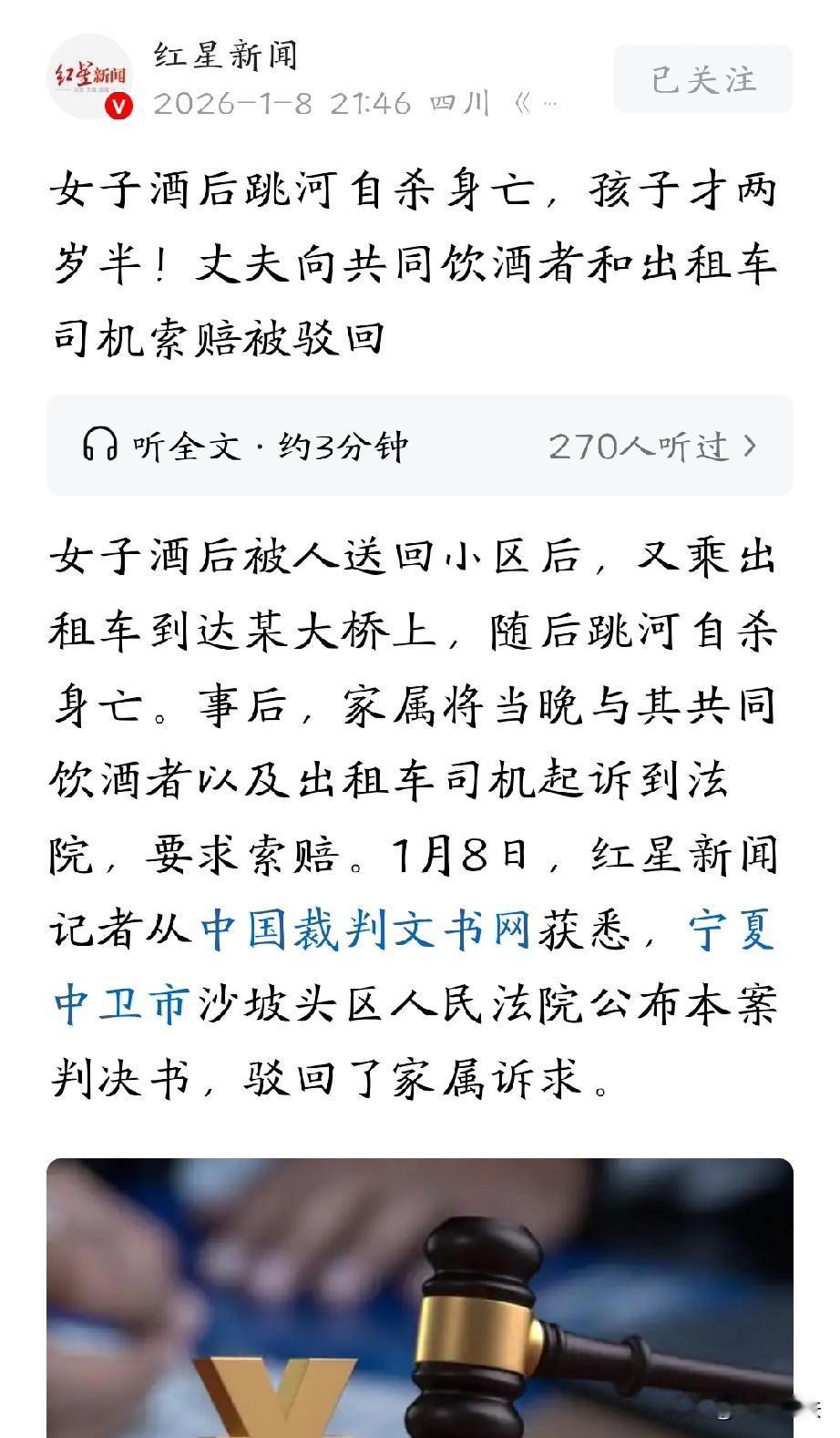 宁夏中卫,女子约朋友出去吃米线,吃完后又找了家酒吧喝酒唱歌,期间,为了热闹,女子叫来了两个朋友和自己的姐夫。喝到晚上9点多,晕晕乎乎的女子先独自离开,到了一处大桥上。姐夫不放心,找到女子并目送她进了小区。接着,丈夫和女子打了视频电话,明知她喝醉了也没有出来接她。女子心灰意冷,又打了一辆出租来到桥上,一跃而下,溺水身亡。这下,女子丈夫不干了,把同饮者和出租车司机都告上了法庭,索赔14万。 2025年5月7日中午一点多,邵某闲来无事,给朋友姚某发了消息,约她一起出去吃米线。 吃完米线后,邵某还觉得不过瘾,又提议去某酒吧喝几杯,两人一拍即合,很快来到酒吧。 虽然邵某是个两岁半孩子的母亲,但酒量很可以,一连喝了好几瓶啤酒。 酒吧里唱了几首歌后,邵某觉得,这家酒吧的音响效果太差了,唱着没劲儿,于是,又和姚某商量着换家酒吧继续喝。 正好,两人碰到了熟人朱某,朱某就带着她们几个去了另一家酒吧。 到了新酒吧,邵某和姚某又接着喝了几瓶啤酒,朱某因为身体不好,全程没有参与喝酒,就在旁边和两人聊天。 下午五点多,邵某觉得他们三个太无聊,又打电话叫来了自己的姐夫康某,大家一边喝酒一边嗨。 待了一会儿后,姚某说自己有点事,就先离开了。几个人又觉得人少冷清,康某又打电话叫来了冯某。 几个人连喝带唱,一直到了晚上9点多,考虑到家里还有孩子,自己喝的也多了,邵某便起身,让其他人继续喝,自己离开了酒吧。 见邵某喝得颠三倒四,走路都不稳当,康某有点不放心,便给她打了个电话,邵某说,自己在桥上。 康某心里“咯噔”一下,生怕她做出傻事,赶紧打了辆出租车赶到大桥找到了邵某,并打车把邵某送到了她家小区南门。 到小区时,已经是晚上10点40多,康某一直看着邵某走进小区,这才坐着出租车,放心地离开了。 可谁能想到,走进小区的邵某并没有第一时间回家,11点左右,她接到了丈夫沈某打来的视频。 邵某迷迷糊糊地说,自己已经到小区门口了,丈夫明显能看出来邵某喝多了,但并没有出门,把邵某接进屋,任由她一个人在外面溜达。 在小区里呆了一会儿,邵某情绪忽然不对了,刚好,出租车司机聂某开着车经过小区南门,邵某竟又打上车,让聂某送她到大桥喝酒。 生意来了哪有不做的道理,聂某没有多想,就拉着邵某到了大桥上。 当晚11点半左右,心灰意冷的邵某站在大桥上,一阵绝望,竟从大桥上一跃而下,最终溺亡。 邵某的意外离世,让一家人无法接受,丈夫沈某觉得,当晚和邵某一起喝酒的人不负责任,在明知邵某醉酒状态后,都没把她安全送回家中,未尽到安全保障责任。 还有出租车司机聂某,大半夜里,把明显醉酒的邵某独自拉到大桥上,违规停车,把人放在大桥上不管不顾,放任其发生了意外。 于是,沈某把当晚共同饮酒的人以及出租车司机聂某都起告上法庭,索赔14万余元。 《民法典》第1165条规定:行为人因过错侵害他人民事权益造成损害的,应当承担侵权责任。依照法律规定推定行为人有过错,其不能证明自己没有过错的,应当承担侵权责任 。 法院调查审理后明确,同饮者康某已将邵某护送进入小区并目视其进入,尽到普通人的通常安全注意义务。 朱某未饮酒、无劝酒,姚某、冯某在邵某离开时已无陪伴义务,均无过错。 出租车司机聂某搭载醉酒乘客至大桥,无证据证明其存在强迫、胁迫或放任危险的过错行为。 邵某作为完全民事行为能力人,对自身饮酒和后续跳河行为负责,其自杀是损害后果的直接、唯一原因,同饮者和出租车司机的行为与损害结果无法律上的因果关系,故不承担侵权责任。 根据谁主张谁举证的民事诉讼规则,沈某主张各被告未尽安全保障义务、与邵某溺亡存在因果关系,应承担举证责任。 但沈某未能完成举证,应承担举证不能的不利后果。 综上,法院驳回了沈某的诉讼请求。
