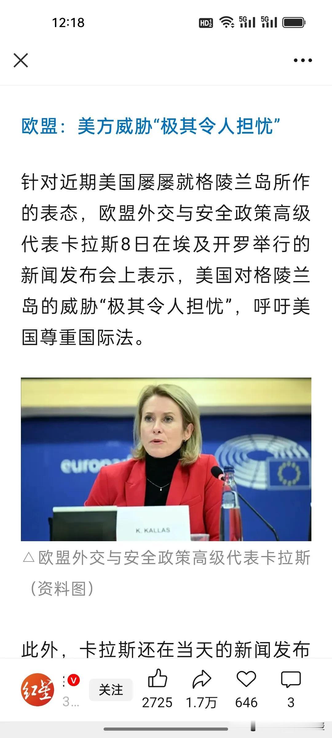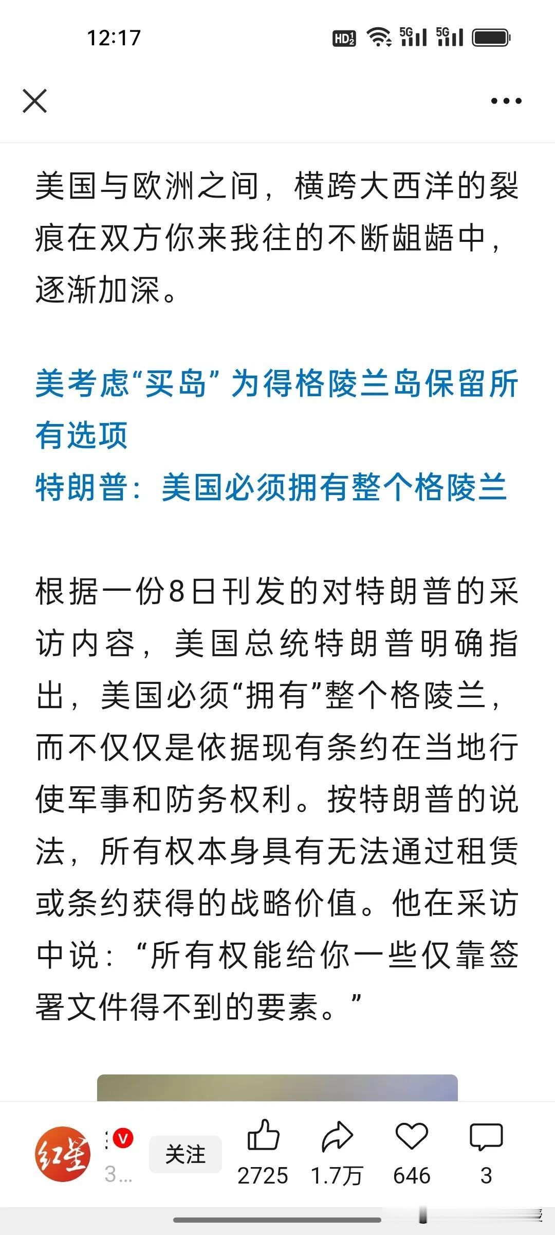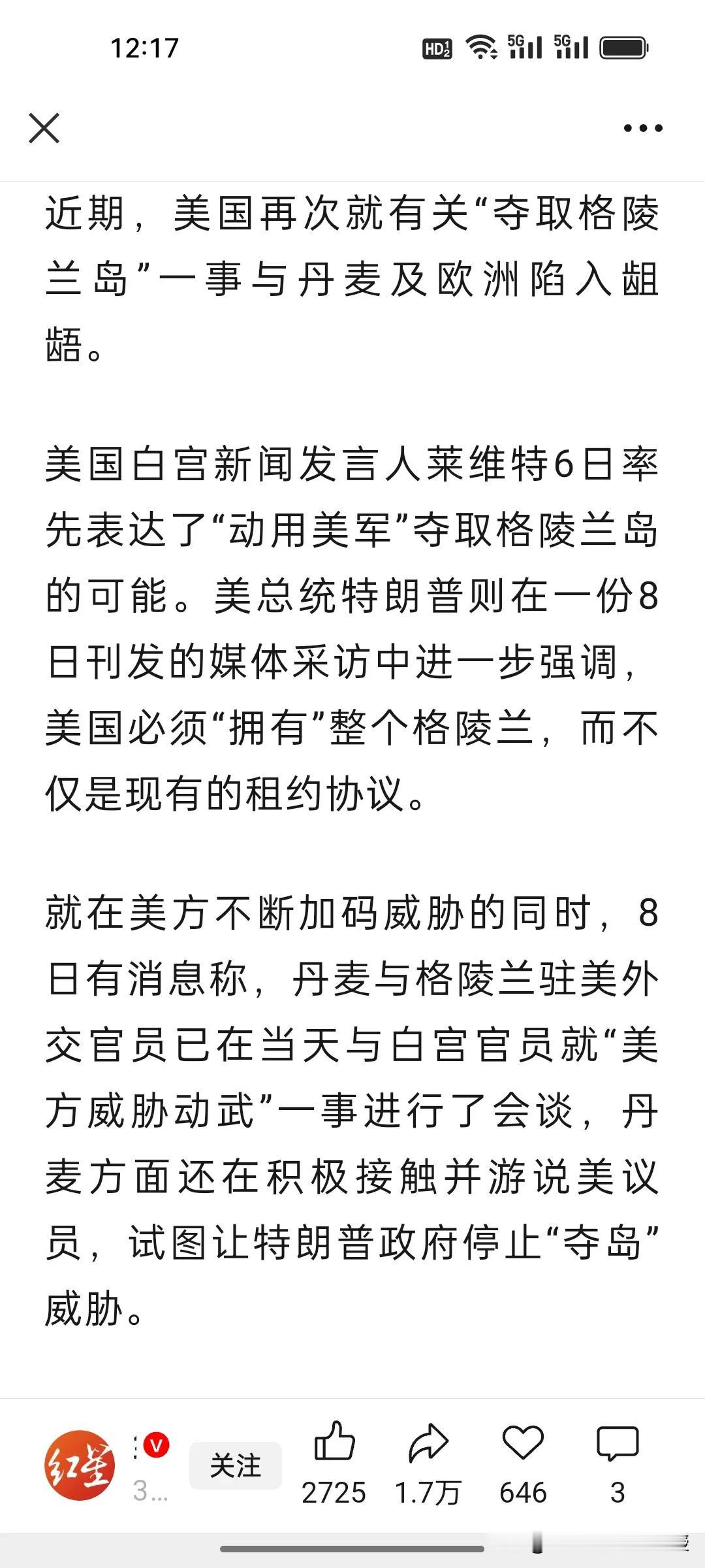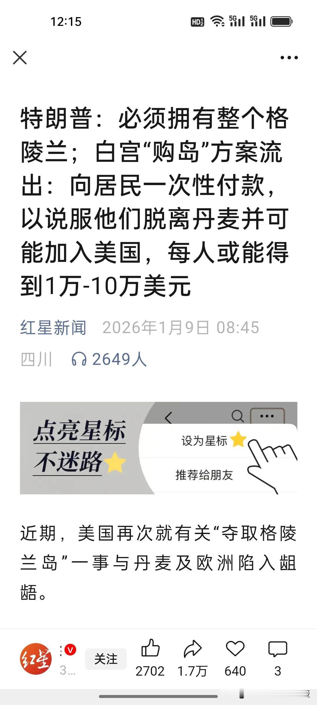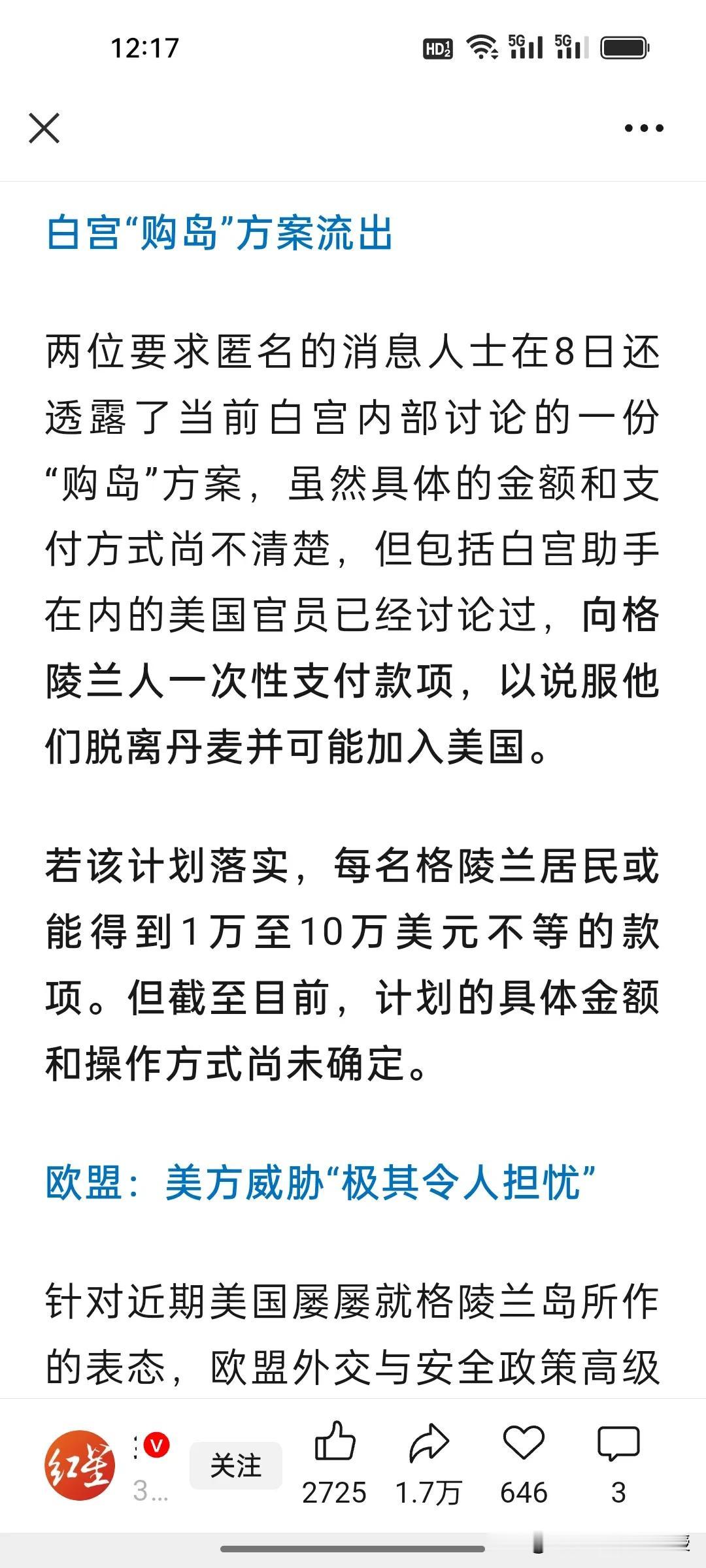 美国或要给格陵兰岛5.6542万居民最高每人发10万美元以购岛,现在要看格陵兰岛居民的定力了。 根据《红星新闻》报道,白宫流出特朗普政府购买格陵兰岛的方案,每个格陵兰岛居民或将得到1—10万美元的补偿。目前具体的金额和操作方案还没有确定。 格陵兰岛总共有5.6542万居民,算了一下,美国购岛总共需要花费5.6884万美元 - 56.884亿美元,美国连欠联合国的30亿美元会费都不交,美国现在会花将近57亿去买格陵兰岛吗?当地的居民会为这区区10万美元妥协吗? 欧盟昨天呼吁美国要遵守国际法,可是特朗普接受《纽约时报》采访时表示,他的“道德观念”是他在世界上行事的唯一限制,他不需要国际法。 因此,从白宫流出的购岛方案上来看,美国通过补偿格陵兰岛的居民获得格陵兰岛领土的可操作性还是很高,就看格陵兰岛的居民的意志坚不坚定了。