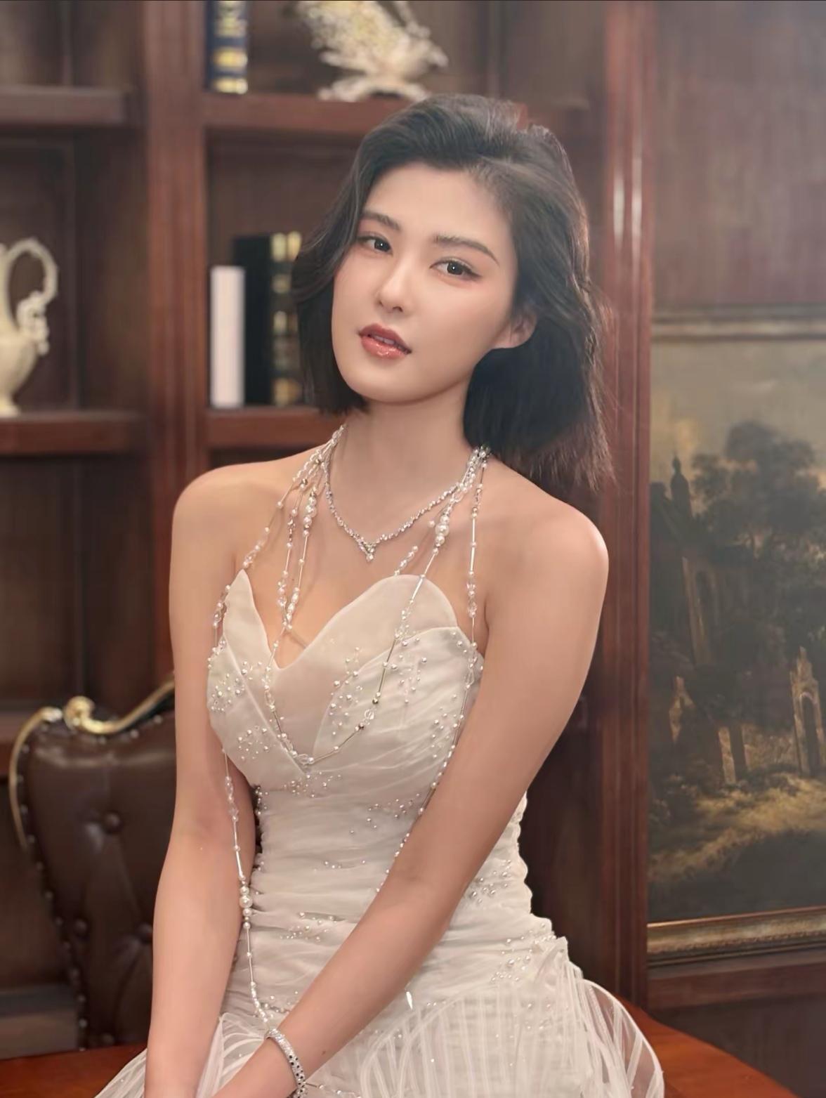 车模程儿,温柔优雅,浅绿色吊带裙,清新自然。