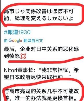 这下日本彻底慌了!高市早苗下台看来要提上议程了! 在近期,日本Nitori董事长在接受采访的时候表示,他非常担忧,希望日本政府尽快采取行动,但只要高市早苗还在台上,那么中日之间的关系几乎不可能改善,唯一的办法就是“更换首相”。 最近中日关系闹得挺僵,主要就是日本首相高市早苗在台湾地区问题上说了些出格的话。她在国会答辩时,直接把台湾地区事态跟日本的存亡危机挂钩,还暗示可能行使集体自卫权,这话一出,北京这边直接看成是干涉内政,严重碰了一个中国原则的红线。外交部多次表态批评,日方这种言论违反中日联合声明里的承诺,性质挺恶劣。 事情没停在那,高市早苗后来几次回应都没完全撤回意思,还在一些场合辩解说符合日本一贯立场,但就是不肯明确重申对一个中国原则的尊重。这让双边气氛越来越紧张,日本那边有些政界和民间声音也开始担心,会不会把关系搞得更糟。 1月6日,中国商务部直接发了2026年第1号公告,加强对日本的两用物项出口管制。公告说,禁止所有这类物项出口给日本军事用户,或者用于军事用途,甚至包括任何可能帮日本提升军力的其他用途。还强调,就算通过第三国转手,也要追责。这招挺狠的,因为两用物项范围广,涵盖稀土、某些化学品、精密设备啥的,日本很多产业都靠中国供应这些东西,尤其是稀土,日本进口量里中国占大头。 日本政府马上抗议,说这不符合国际惯例,要求撤回。但中方立场很清楚,这是维护国家安全、履行国际义务的正当措施,直接回应日方领导人的错误言论。日媒报道说,这可能对日本企业造成大影响,汽车、电子、半导体这些行业供应链得重新找路子,成本肯定上去。 日本商界这下真急了。Nitori家具连锁的董事长似鸟昭雄是日本零售大佬,他企业靠中国供应链不少,这次管制一出,他公开接受采访,说得很直白:中日关系这么差,企业很愤怒,也很担心。光靠企业自己解决不了,得政府出面行动。但只要高市早苗还在位子上,关系就很难缓和,唯一的办法就是换首相。这话听着挺冲,毕竟商人平时不太直接掺和政治,但他这么说,肯定是看到实打实的生意风险。 不像政客说话拐弯抹角,似鸟昭雄作为重量级企业家,生意遍布全球,他鼻子灵,哪儿有机会哪儿有坑门清。他敢这么公开喊话,说明日本经济圈里不少人憋着火,觉得当前政治路线在伤自家饭碗。中日经贸绑得死死的,从零部件到日常商品,哪能说断就断。中国市场那么大,日本企业真舍得扔?政治上再这么僵下去,经贸领域一受凉,日本企业和老百姓日子都不好过。 高市早苗上台后,本来就推强硬路线,增加防卫费,拉紧美日同盟,这些在日本国内有支持,但也让周边警惕。现在管制措施一落地,日本企业库存压力大,部分工厂可能得调整生产线,股价都受影响。日方想通过外交渠道沟通,但中方坚持错在日方先,得先管好自家言论。 到现在,高市早苗还在位子上,内阁支持率有点波动,但下台还没到那步。商界像似鸟昭雄这样的声音越来越多,呼吁政府换思路,多想想务实合作,别光顾着对抗。毕竟,对抗没出路,合作才能把盘子做大。中日都是大国,关系稳了,整个地区都受益。球现在在日本那边,看他们怎么选。企业着急归着急,政治决定经贸,短期内关系回暖难,但长远看,大家都希望别把路走死。