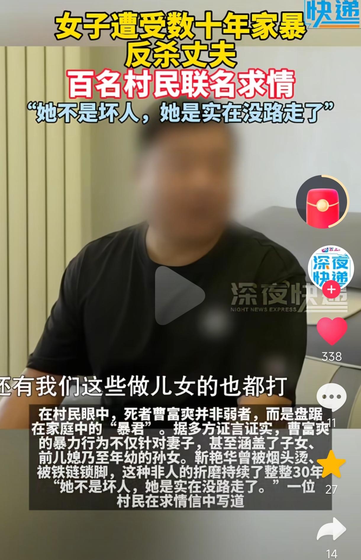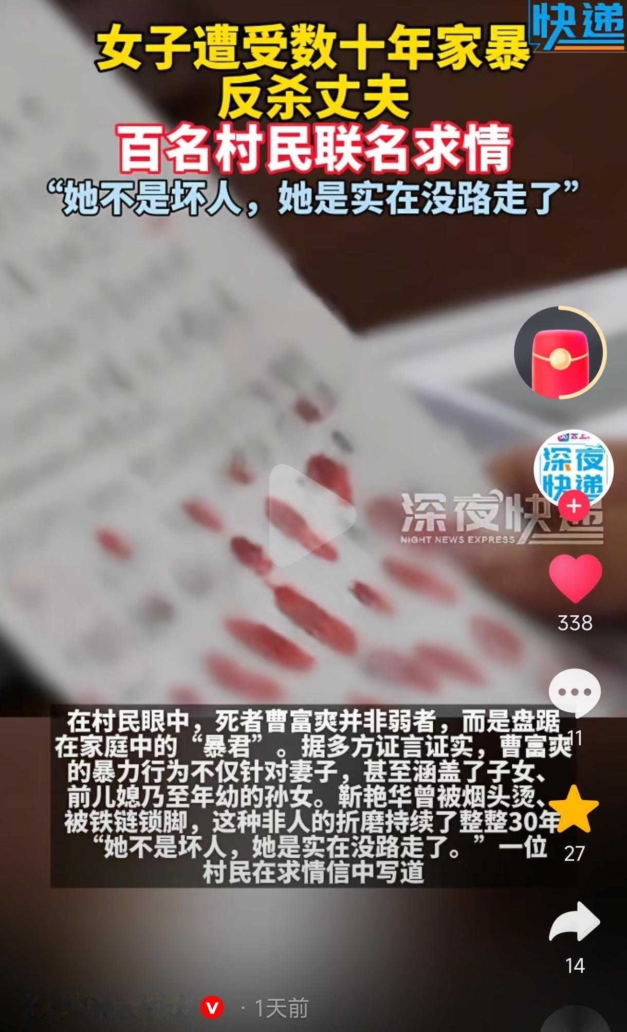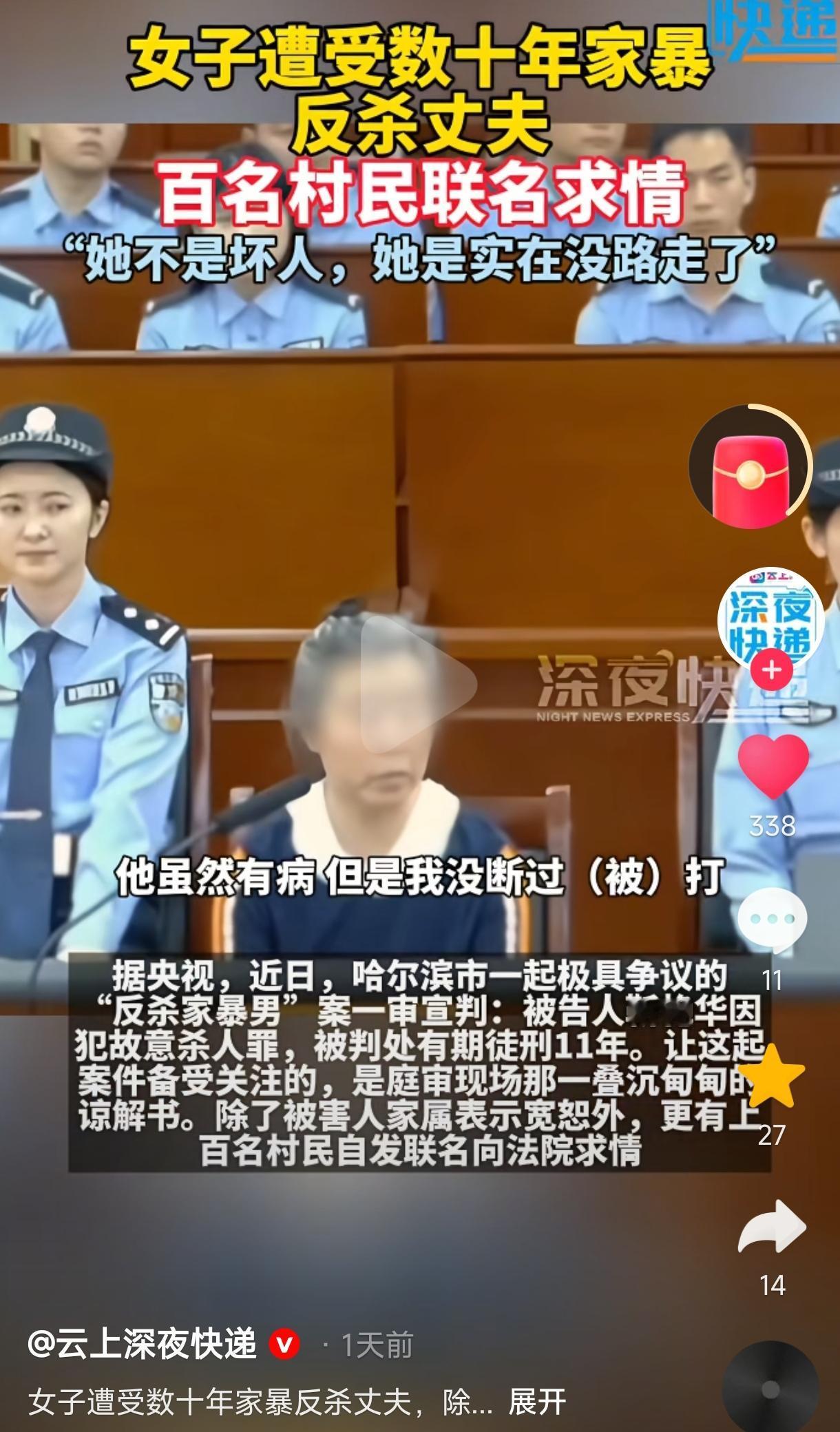 半夜,女子上厕所回来刚躺下,就被丈夫打头、掐脖子......奄奄一息之际,女子用尽全身力气强挣出来,这下她彻底爆发了,抡起斧头就击打丈夫头部,二人从家里打到街头,之后女子用板砖砸向丈夫头部,最终丈夫倒在血泊中,女子吓坏了,赶紧拨打了120,但丈夫还是不治身亡了,女子以故意杀人罪被拘。没成想,庭审现场,对于女子反杀丈夫的行为,除了被害人家属全部表示谅解外,更有上百名村民自发联名向法院求情,那一叠沉甸甸的谅解书最终挽救了女子的性命,女子获刑11年,彰显了法律的底线与温度。 (来源:大象新闻、长江云新闻等) 哈尔滨女子靳燕华与丈夫曹富爽结婚30多年,却长期遭受丈夫非人般的毒打,连孕期都不放过,靳燕华的婚姻堪称一部长达30年的血泪家暴史。 曹富爽是一位脾气暴躁、人品低劣的人,酗酒、赌B、家暴等样样不落,即便妻子在孕期依然殴打、拿烟头烫伤等,完全将一个彻头彻尾的渣男诠释得淋漓尽致! 靳燕华生下儿子后,被丈夫毒打更是家常便饭的事,靳燕华称,她经常被丈夫打得只留一口气,有时被打昏后丈夫还丧心病狂用水浇醒她又接着打,丈夫喝醉更是变态还用刀子来回划她大腿等,就算她生了重病,丈夫也丝毫没有手软,没有停止过毒打......而这种变态的暴力相向还整整持续了30年,靳燕华真是太可怜了。 这哪里是一个丈夫,分明就是一个恶魔! 孩子们从小生活在这样的家暴场景中,心里早已留下了难以抹去的伤痕,曹富爽不仅打妻子,还打儿女,简直打遍了一家人。靳燕华儿子称,父亲经常对他拳脚、棍棒相向,见啥就拿啥打他,他的前妻、孩子等人都被打他过,简直就是家庭里十足的“暴君”。 曹富爽还威胁家人不要对外求助或者报警,妻儿们也是见惯了他的狠戾,不敢多有声张,靳燕华害怕丈夫报复,更是不敢提离婚。 就这样,妻子的一贯隐忍令曹富爽变得更加的肆无忌惮。常言,不在沉默中灭亡,就在沉默中爆发,终于这一天,靳燕华忍无可忍了。 2026年1月的一天凌晨,靳燕华上厕所回来后躺床上准备入睡,丈夫却骂骂咧咧地与她争吵起来,甚至开始动用拳头挥向妻子,之后又掐住妻子的脖颈,强烈的窒息感令靳燕华几乎晕厥过去,所幸后来她奋力强挣了出来,捡回了一条命。 这下靳燕华忍无可忍了,丈夫竟然想掐死自己,刹那间多年的隐忍、委屈与不甘等情绪在那一刻彻底爆发了,她抡起斧头就往丈夫身上招呼过去,丈夫赶紧躲避但也受了伤,这下他吓蒙了他真是没想到妻子会反抗,就对她破口大骂起来,这下两人都彻底打疯了,从家里一直打到街头。 这一次,靳燕华用尽了毕生的力量在与丈夫对抗,却也将自己推向了深渊...... 女子的力量毕竟还是有限,后来靳燕华渐落下风,手上的斧头被丈夫打落在地,自己也倒在了街头的花坛边上,这时她突然瞥见了花坛里有一些砖块,然后眼疾手快,抓起砖块就砸向曹富爽的头,最终曹富爽倒地不起,头上鲜血直冒,没了声音...... 靳燕华吓坏了,她的初衷只是不想让丈夫再伤害自己,并不是真正想让丈夫死,她见丈夫倒下没声后,赶紧拨打了120,但最终丈夫还是因伤重不治而亡。 这个恶毒的家暴男本是恶从胆边生想要伤害妻子性命的,没想到却被妻子反杀了,临死前怕是肠子都悔青了。 之后靳燕华以故意杀人罪被拘捕,但在庭审现场,却出现了极为罕见的一幕,令不少人为之动容不已。 庭审现场上,出现了一摞沉甸甸的谅解书,那里边有受害人子女亲属等的谅解书,还有当地百名村民自发为靳燕华出具的谅解书、求情信等,可见曹富爽这人在当地早已声名狼藉在外,被村民们痛恨至极了。 有一位村民还这样为靳燕华说好话:“她不是一个坏人,她实在是没路走了。”看得人潸然泪下。 大家的集体求情也感动了法官,但是靳燕华遭遇的家暴史不能抵消刑责,女子的激烈反抗行为也不构成正当防卫,但因属于自首行为且认罪认罚,最终被轻判获刑11年。 靳燕华虽然反杀了丈夫,但最终还是保全了性命,获刑11年也算从轻处罚了。 很多人会认为靳燕华属于正当防卫,是“绝境反抗”,应该无罪释放,但因家暴在案发前已经结束,后续攻击不符合防卫即时性,因此应排除正当防卫。 还有靳燕华被家暴30年没报警,无就医记录,家暴的证据仅依赖村民联名与走访,影响了防卫与情节认定的强度,因此女子若遭遇家暴需留下伤情照片、录音录像、证人证言等强有力的证据才最有效的。 靳燕华真的太可怜了,被丈夫残忍折磨30年,之后鼓起勇气反抗却反S了丈夫自己还要服刑11年,婚姻究竟给女人带来了什么? 常言, 一日夫妻百日恩,百日夫妻比海深。女人嫁给你是跟你过好日子的,不爱了,也请别伤害,否则造成严重后果,悔之晚矣!
