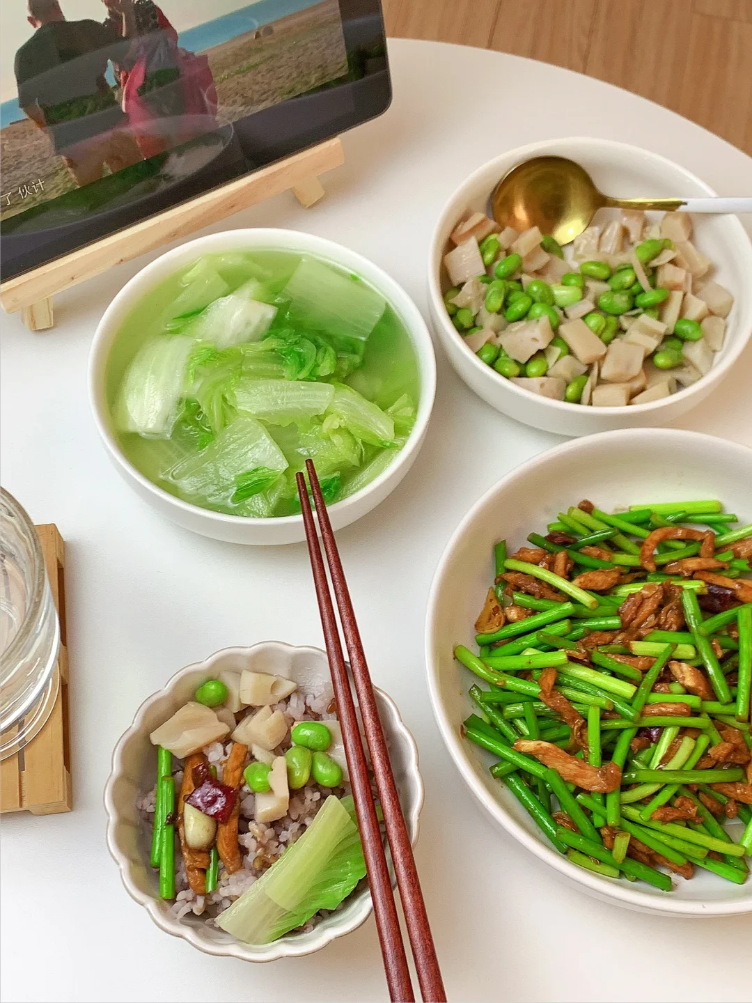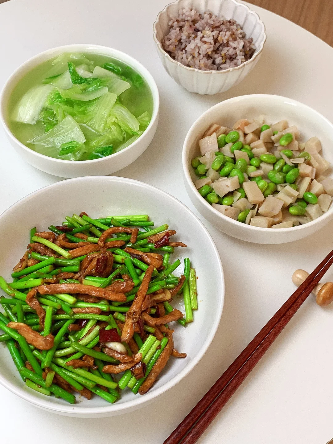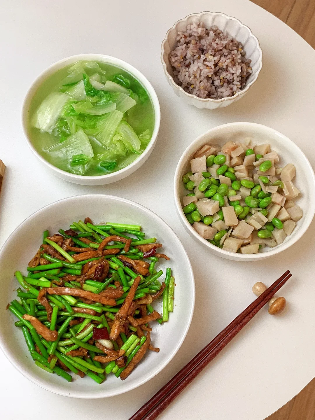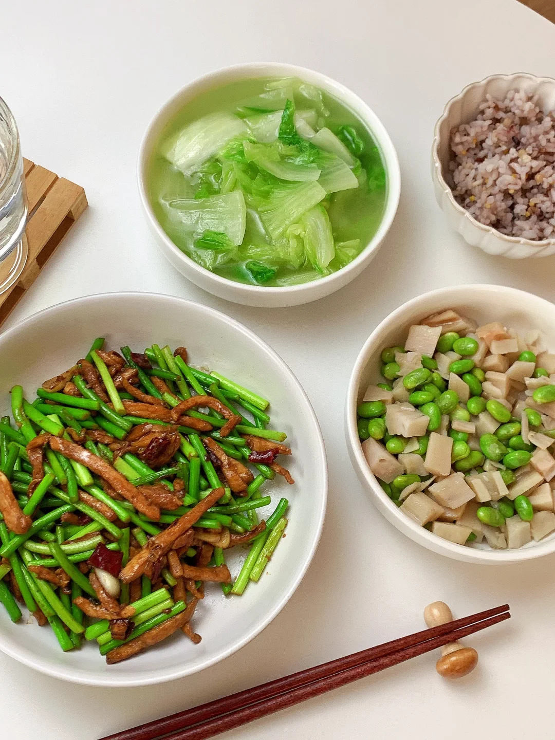 👩🏻🍳分享今日菜单 [一R]水煮白菜🥬 [二R]毛豆炒莲藕 [三R]蒜苔炒肉🧆 主食:米饭🍚 ……………………………………………………………………………… 🛒食材清单: 蒜苔 | 鸡胸肉 | 白菜🥬 | 莲藕 | 毛豆 📝我的美食日记,一日三餐,拒绝外卖[偷笑R],坚持做饭的每一天,吃简单干净的饭菜~ ₍˄·͈༝·͈˄*₎◞ ̑̑