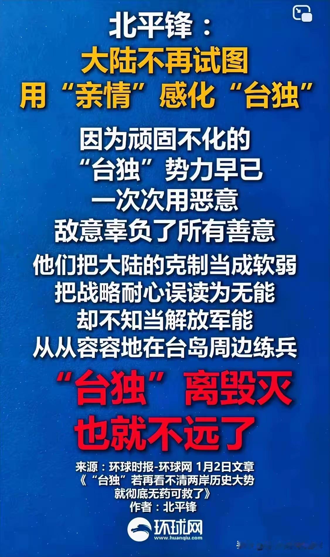 “台独离毁灭不远了!”为啥说顽固台独势力彻底没活路了?北平锋这话直接戳中要害! 大陆掏心窝子用亲情感化,惠台政策给台胞送福利,可台独势力呢?把善意当软弱,把克制当无能,一次次搞分裂小动作! 现在解放军在台岛周边常态化练兵,战机绕台、军舰巡航,这就是最硬的警告!台独分子要是还看不清大势,最终只能是死路一条! 两岸一家亲是刻在骨子里的,分裂国家绝无好下场!你觉得台独势力还能蹦跶多久?评论区说说你的看法! 歼灭台独 台独妖孽 通辑台独 台独水军