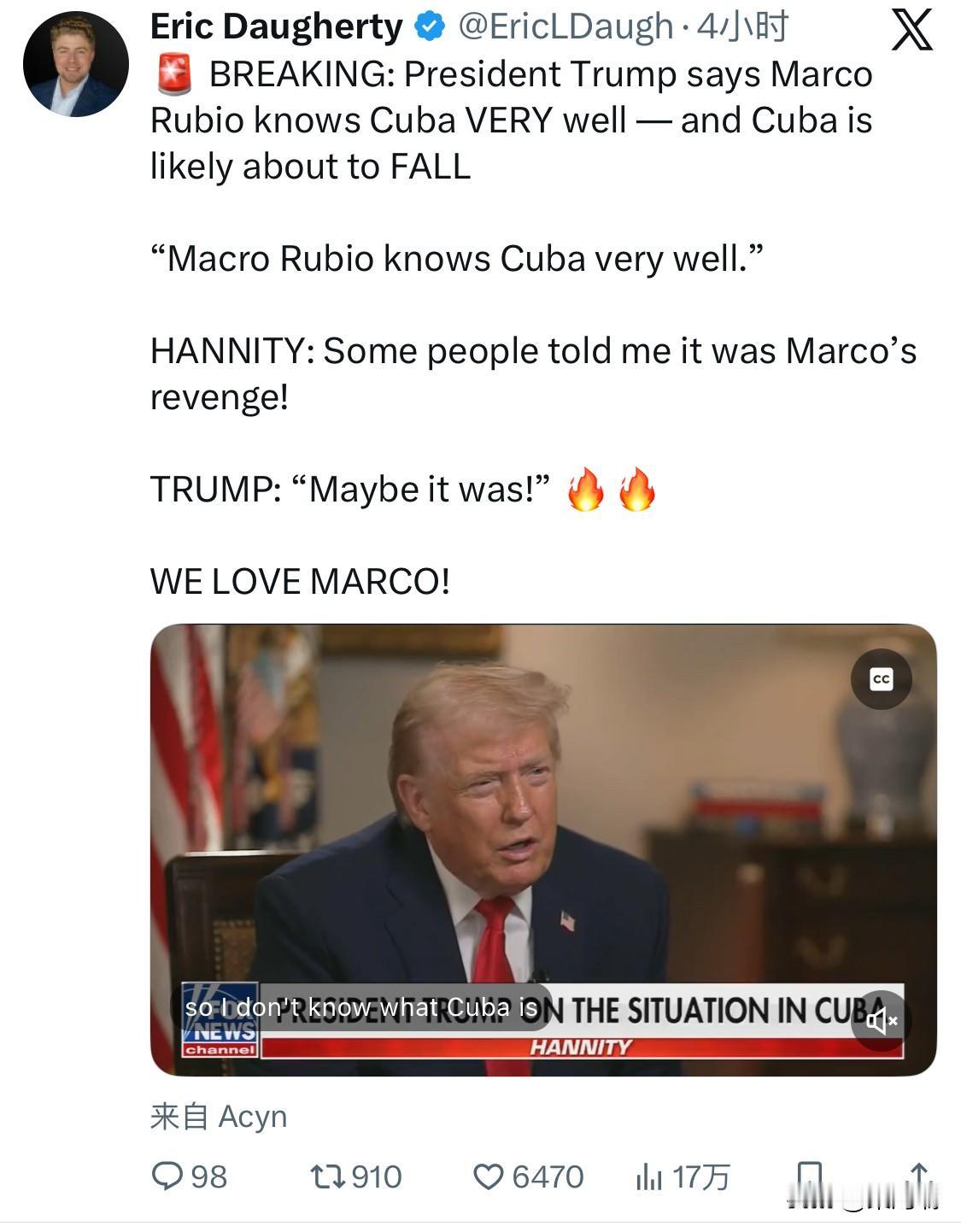 突发新闻:在福克斯新闻 (Fox News) 的节目《汉尼蒂》(Hannity) 中,特朗普总统称马可·卢比奥非常了解古巴——古巴很可能即将沦陷 “马可·卢比奥非常了解古巴。” 汉尼蒂:有人告诉我这是马可的报复! 特朗普:“也许是吧!” 我们爱马可!