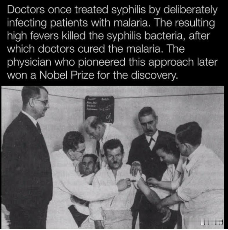 奥地利的医生们曾用一种方法治疗梅毒:故意让患者感染疟疾。由此产生的高烧会杀死梅毒螺旋体,之后医生再治愈疟疾。率先采用这种方法的医生后来因这项发现获得了诺贝尔奖。 奥地利精神病学家朱利叶斯·瓦格纳-豪雷格(Julius Wagner-Jauregg)开创了这种称为疟疾疗法(Malariotherapy)的方法。 原理: 在抗生素发明之前,晚期梅毒(特别是导致痴呆和麻痹的神经梅毒)几乎无法治愈且致命。瓦格纳-豪雷格观察到,伴随高烧的疾病有时能改善梅毒症状。他利用疟疾原虫引发患者持续高烧(有时超过40°C),这种高温可以杀死导致梅毒的梅毒螺旋体细菌。 后续治疗: 梅毒细菌被杀死后,医生会使用当时已知的药物奎宁来治疗疟疾感染。 结果与认可: 这种疗法虽然有风险(约15%的死亡率),但在当时是一种突破性的治疗方法,挽救了许多生命。瓦格纳-豪雷格因此于1927年被授予诺贝尔生理学或医学奖。 随着20世纪40年代抗生素(尤其是青霉素)的广泛使用,这种危险的疟疾疗法被更安全、有效的治疗方法取代。 这种治疗方法在医学史上是一个独特的例子,即故意引入一种疾病来治疗另一种疾病。