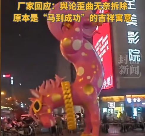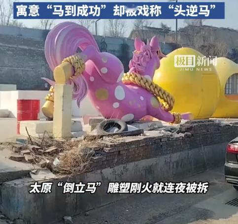 “这个‘马’火了!”近日,山西太原,一商场为迎接2026农历马年特意找设计师设计雕塑造型,耗时近三个月,修改上百稿后最终定稿——粉色倒立骏马雕塑,没想到雕塑摆在商场门口没两天便引来了网友热议。商场:立马拆除。 随着2026马年的到来,很多商场、门店纷纷更新了生肖摆件。各种主题美陈不仅造型吸睛十足,而且都有着美好寓意,比如“马到成功”、“马上成功”、“马上暴富”等,这些摆件既承载着美好寓意,又会成为打卡亮点,不过想要设计出圈的摆件,着实要花些心思。 据媒体1月6日报道,当地商场在近期更换了门前的美陈造型,撤掉了蛇年的造型设计,换上马年的新雕塑——这座雕塑高1.8米,采用不锈钢打造,通体粉色、佩戴金色墨镜,四蹄朝天的倒立造型本是借“马倒”谐音“马到”,寓意“马到成功、马上有钱”。 这款设计是设计师按商场设计方案制作,耗时近三个月,修改上百稿才定稿,雕塑刚展出便吸引大量市民打卡,成为热门网红地标。不过很快有本地网友发现,马头朝下的造型在太原方言中被也可以被解读为“头逆马”,发音与当地粗俗辱骂语高度相似。该谐音梗迅速在社交平台发酵。 原本吉祥的雕塑沦为争议焦点。随后,商场紧急动用吊车拆除雕塑,回应为“不可抗力因素,影响不好”,后负责人补充称是“为保护IP形象,避免好作品被曲解”。 网友对此看法两极:部分人支持商场及时止损,认为公共艺术应兼顾文化敏感性;也有网友惋惜“一拆了之”过于保守,建议可借势科普或推出文创转化流量。 信息来源:《太原倒立马雕塑被拆除此前因谐音梗引发热议,生产厂家:好多人提出购买想法,已运回厂里(潇湘晨报)》宁波晚报