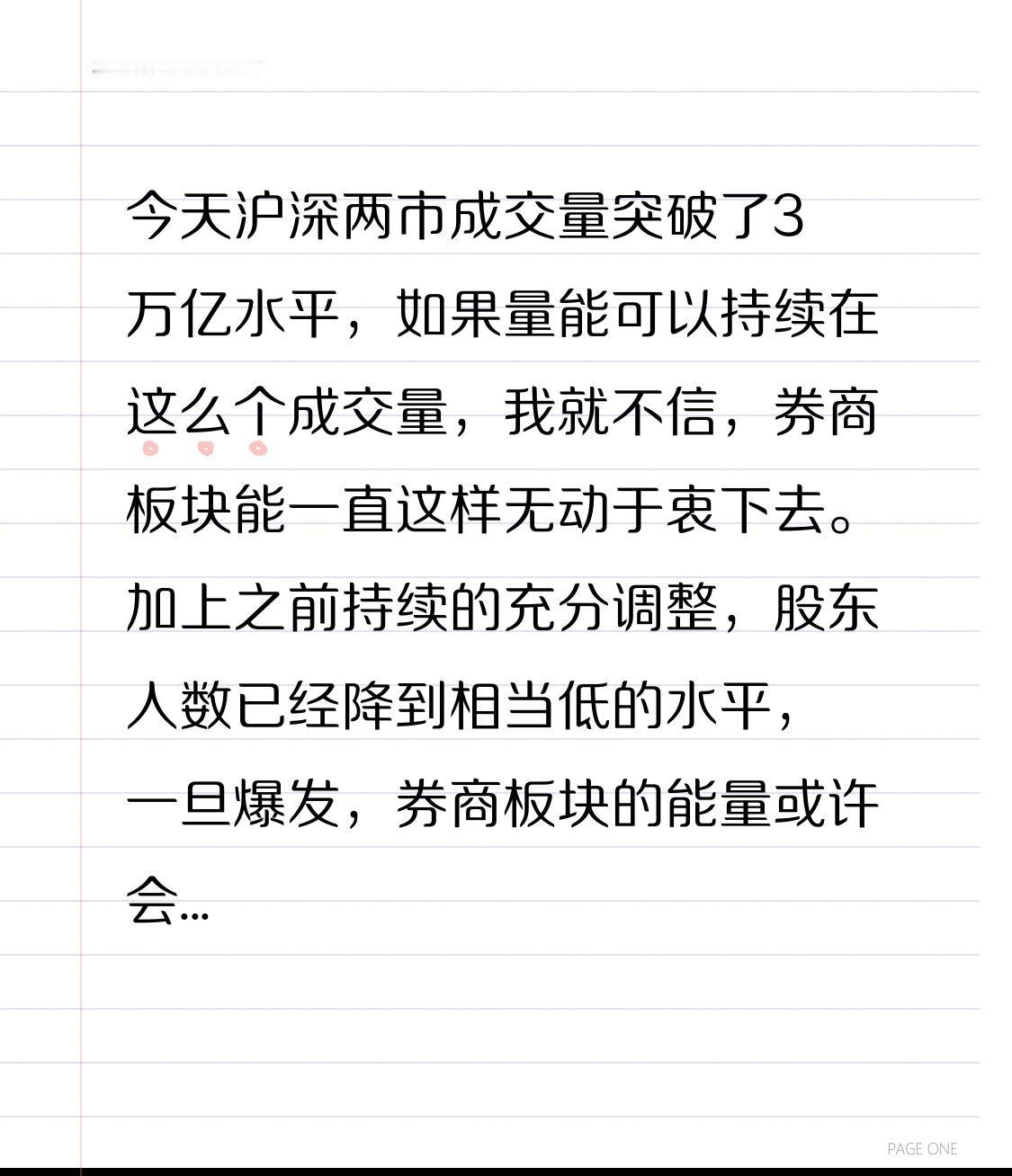 今天沪深两市成交量突破了3万亿水平,如果量能可以持续在这么个成交量,我就不信,券商板块能一直这样无动于衷下去。 加上之前持续的充分调整,股东人数已经降到相当低的水平,一旦爆发,券商板块的能量或许会亮瞎你的双眼! 券商 证券板块 券商行情