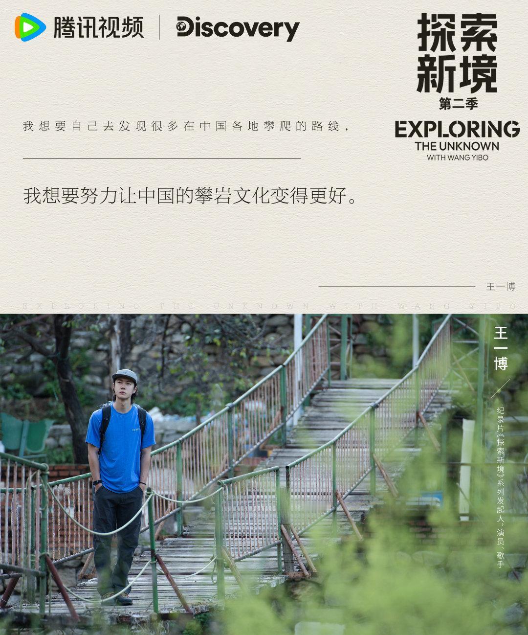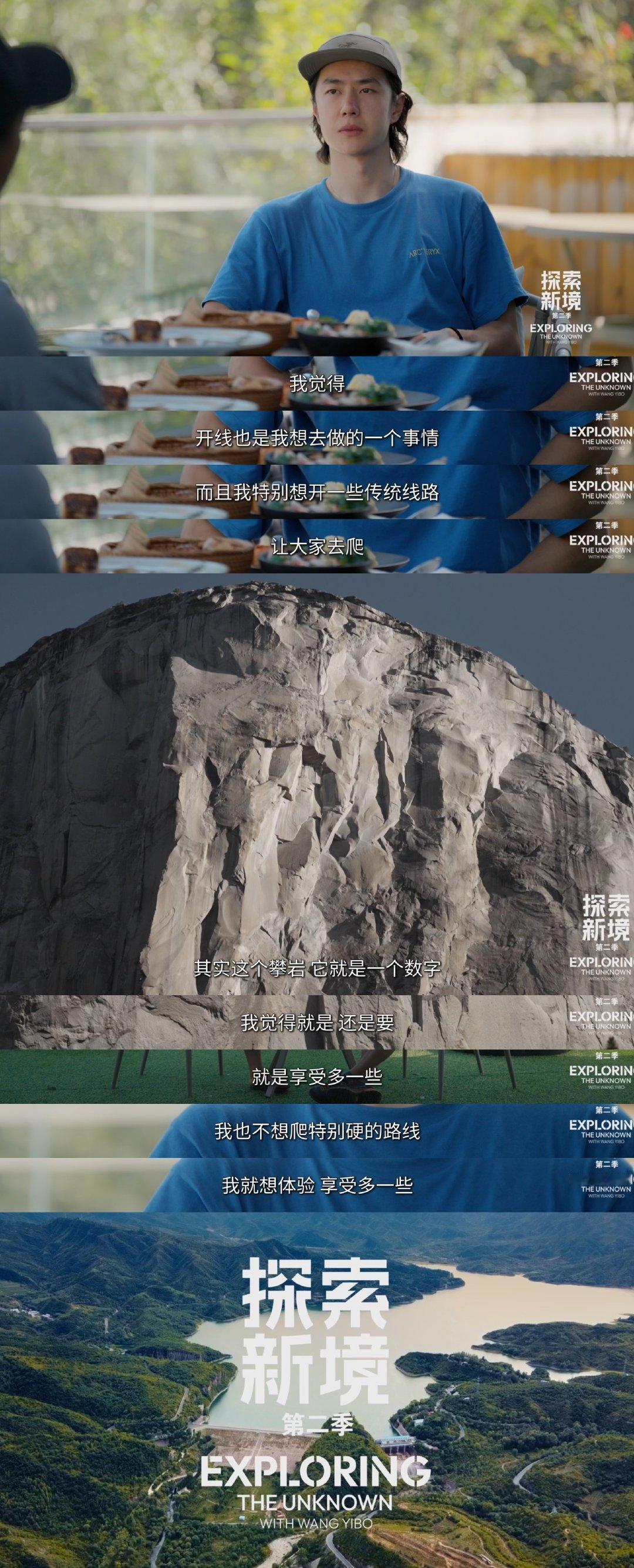 “现在我对于攀岩的感受,我会觉得我想要一直做下去,我确实是找到了一个我很喜欢做的事情。” “我自己想要去攀爬,我自己想要去发现,还可以在中国很多地方攀爬的路线。” “我想要努力让中国攀岩文化变得更好。” “其实现在我也是一个在学习的阶段,去尝试更多可能,让自己一直进步。” “我觉得这也是攀岩的一个乐趣,最终总是会找到自己爬不上去的线。” 内核强大,情绪稳定,自信却不盲目,对热爱执着坚定,不畏惧失败不畏惧流言也不接受pua,有着永不服输的韧性更有着将热爱做到极致的底气与天赋。 王一博,一个到哪里都能成为顶峰上的那个人。 王一博 王一博探索新境2