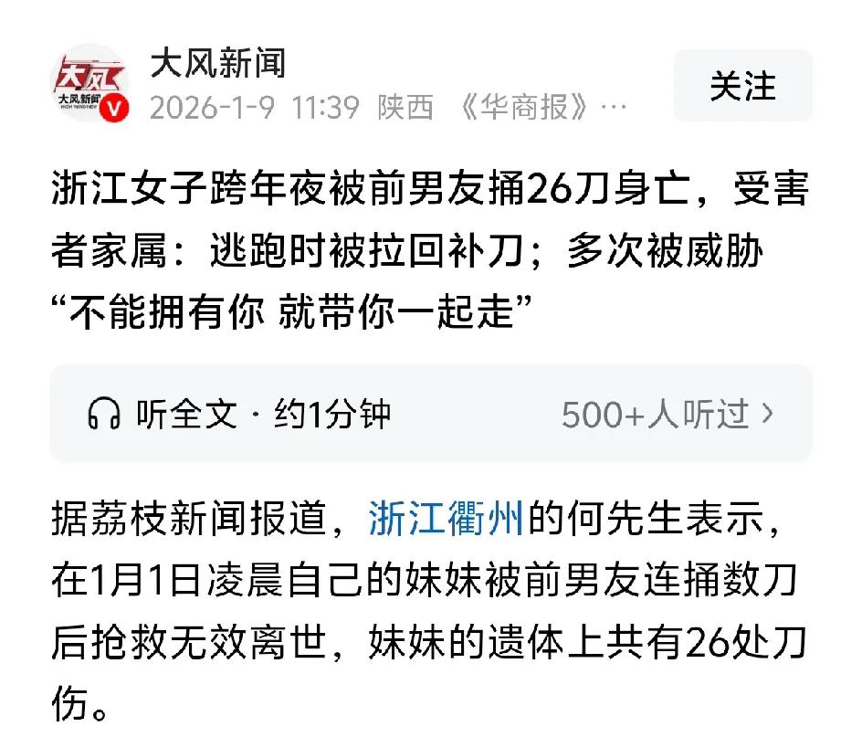 爱而不得,痛下杀手。跨年夜,浙江衢州一男子捅了前女友26刀。女子跑了又被拽回,扬言,得不到你,就和你一起死。 事发一月一日凌晨,犯罪嫌疑人约前女友出来吃饭。两个人相识于2019年,谈了五年多,去年10月份分手的。分手后男子多次约女的出去求和。一次把她带到山上求和不成想要害她,女子跪下求他,他才放了她。 让人不理解的是,为什么跨年夜女方还同意了和他一起吃饭。吃完饭,男方又求和,女方拒绝,这一次她没有那么幸运。 女方这个时候如果假装同意复合也许能逃过一命。 还是太信任对方。 信息来源:大风新闻