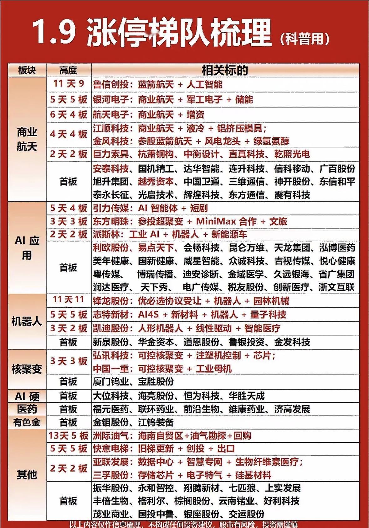 1月9日涨停梯队梳理 📈📈📈 一图看懂热门板块与概念股! 商业航天、AI、机器人板块活跃,多股连板创新高,涉及风电、储能、医疗等热点,市场情绪高涨但需谨慎投资。