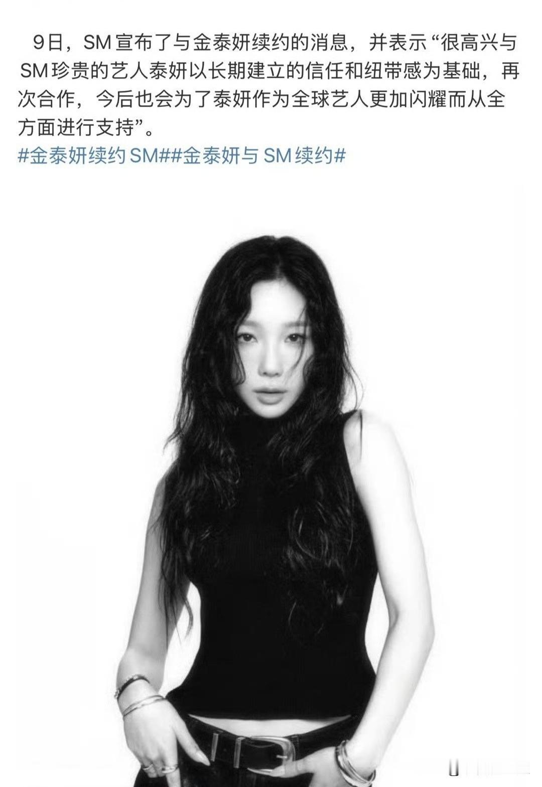 SM官宣和少女时代泰妍续约!泰妍是少女时代的主唱担当,唱功一绝,高音稳,情感细腻得能把人唱哭。她的个人作品也超棒,像《I》《Rain》等,每一首都火得一塌糊涂。 这次SM说会全方位支持泰妍,看来是要让她在演艺道路上继续发光发热。泰妍这些年不仅在音乐上成绩斐然,综艺表现也可圈可点。 有了SM的助力,说不定以后能看到她更多精彩的舞台,新专辑也值得狠狠期待一波! 泰妍巡演