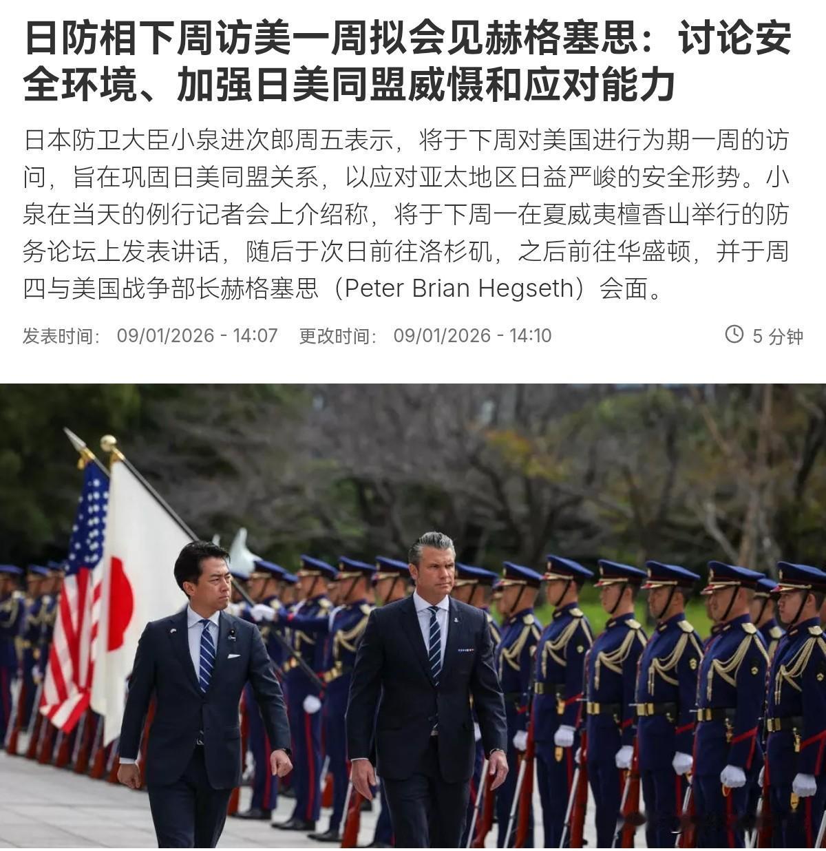 太尴尬了!日本防卫大臣小泉进次郎即将访美,但有一个尴尬的问题,摆在日本面前,不容日本躲闪!1月9日,根据外媒报道,日本防卫大臣小泉进次郎表示,他本人将于下周对美国进行为期一周的访问。而此次访问,小泉进次郎挑明了自己主要的两个目的。其一,巩固日美同盟关系,以应对所谓的亚太地区日益严峻的安全形势。 其二,就中方采取的仅针对日本的措施,日本希望包括美国在内的各国向中国提出抗议,支持日本。当然,就在小泉进次郎召开记者会宣布个人行程时,现场的记者提了一个问题,让小泉进次郎感到格外的尴尬。有记者就问,如果美国国防部长赫格塞思敦促他公开支持美国近期在委内瑞拉的行动,日本该如何应对? 面对记者丢出来的这个冷不丁的问题,小泉进次郎内心显得很慌乱,只得支支吾吾的表示,在会面前很难回答这个问题,国际社会必须努力通过外交途径恢复委内瑞拉的民主,稳定局势。很显然,在日本面对我们重压之际,说的直白一点,小泉进次郎此次去美国访问,本质上就是寻求美国给支持去的。但问题是,日本要美国的支持,美国难道就不需要日本在重大问题上进行表态,站在美国那一边吗? 从小泉进次郎的反应来看,这说明他本人对于美国的诉求,完全没有心理准备。在美国入侵委内瑞拉的背景下,小泉进次郎选择此时访美,日本的立场必然将会引起各国极大的关注。如果日本站到美国一边,支持美国破坏国际法的行为,这恐怕会引发各国极大的警惕和不满。但如果不支持美国呢?美国肯定会不高兴。无疑,日本的处境非常的尴尬,事实上日本也没有躲闪的空间。