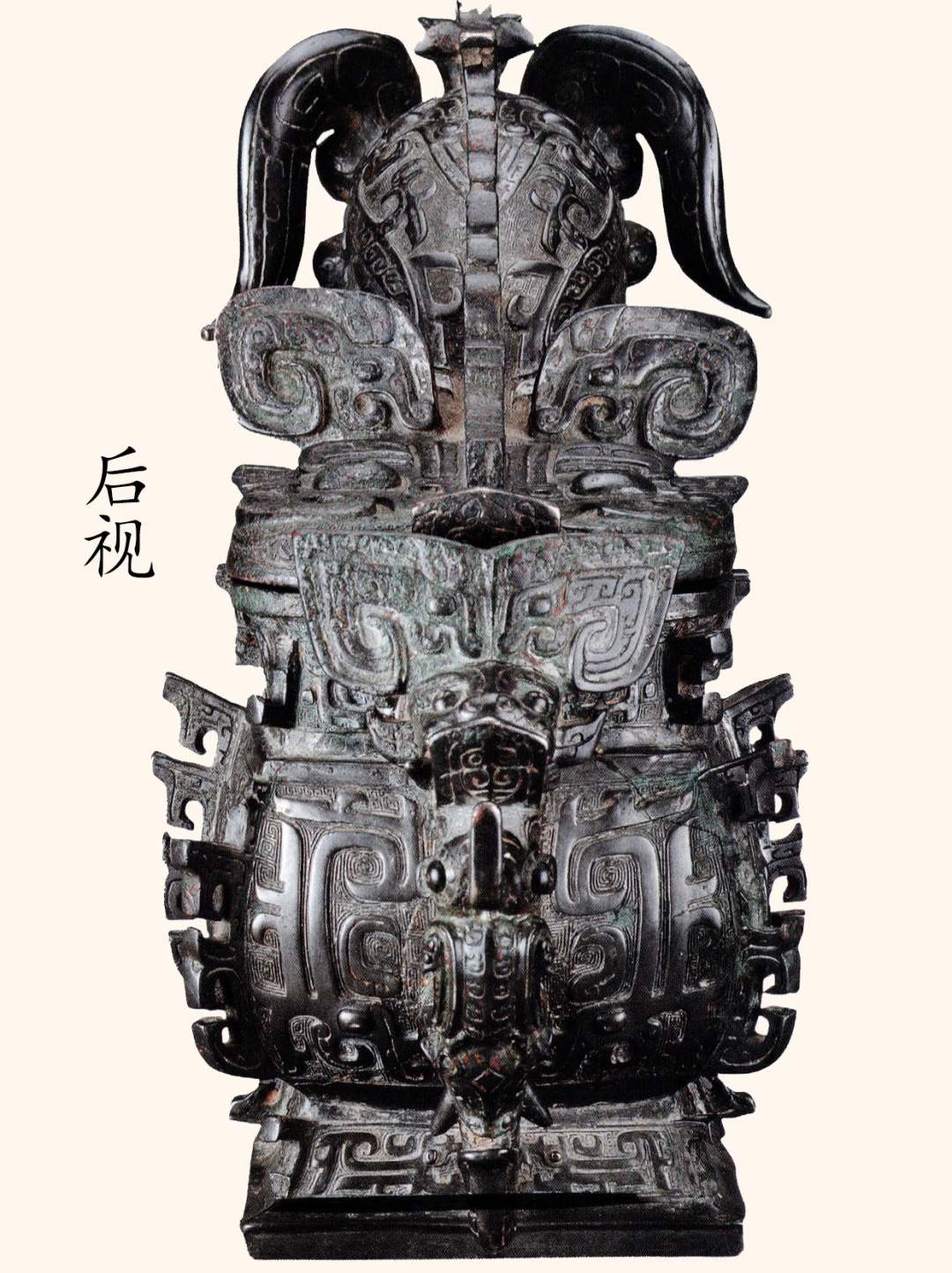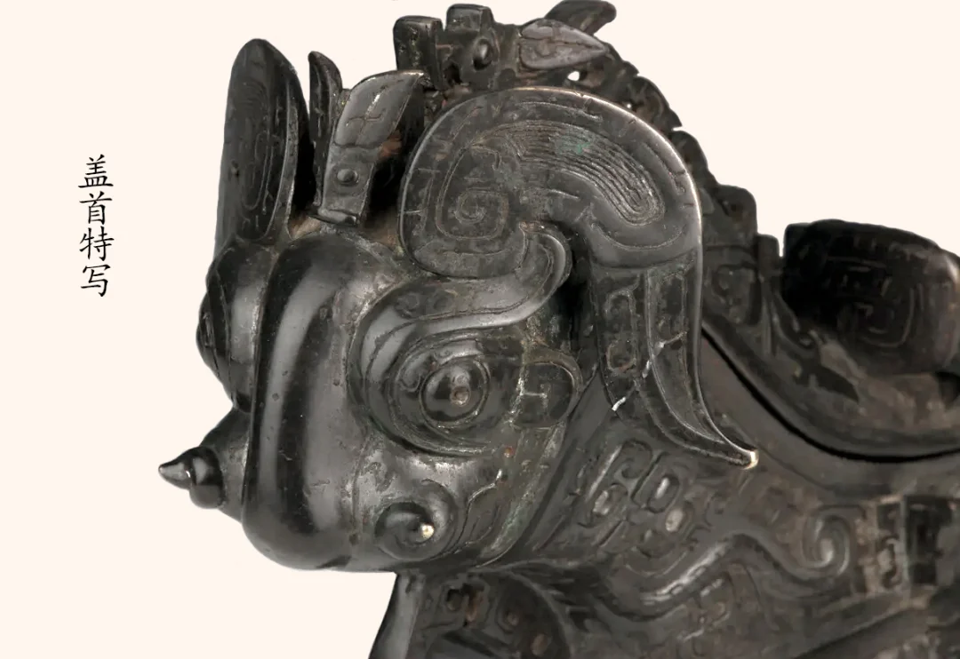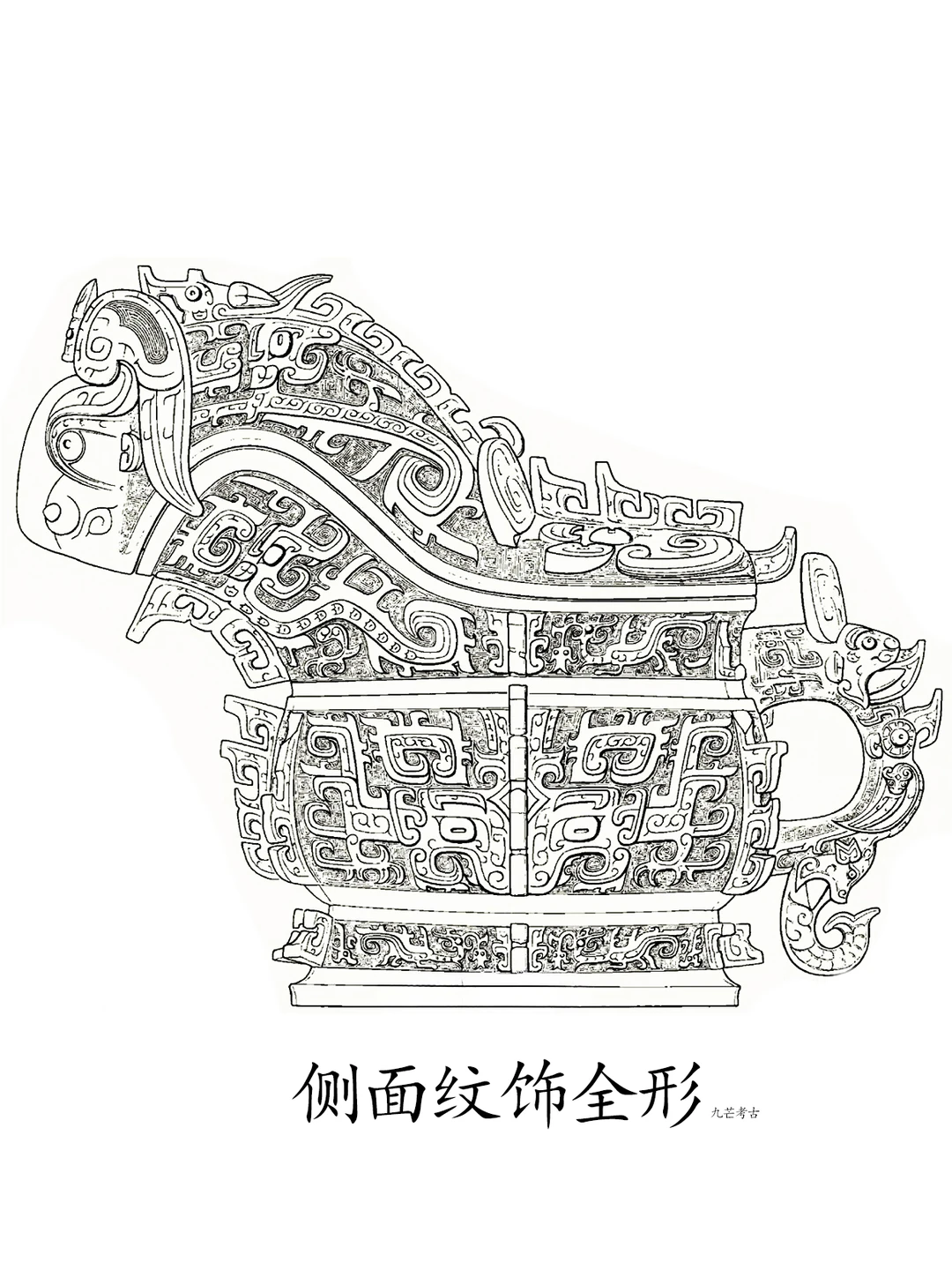 整器满花浮雕,立体感较强。盖首端为一兽首面,圆雕羊角向下弯曲,,上饰阴线纹;高鼻鼓目,两齿外露,两角之间置一圆雕龙首,从龙首处开始,在盖脊正中延伸一条扉棱,饰为龙身,直到盖身后部饰圆雕向上卷曲龙尾:盖身饰二组大回首夔龙纹,以扉脊为界。盖尾部亦饰一饕餮纹雕饰,圆雕兽角内卷曲,角面饰两对视的卷鼻卷尾夔龙纹,饕餮圆面,叶形耳,粗眉圆目,嘴角内卷,鼻前端向前凸起;盖尾部出圆雕兽尾示器盖部兽尾。器身扉棱将纹饰分为四个部分,颈部饰一大回首夔龙纹,扉棱后饰一小回首夔龙纹,腹部前后两面各饰竖体夔龙纹,前部以扉棱为界,后部有鋬,以阴线刻蝉纹为界;器身两侧面各饰一组大饕餮纹,以扉棱为界;圈足上饰四组两两相对的回首卷尾夔纹,圈足侧面两组夔纹较长,前后面两组夔纹较短。整器以雷纹衬地。
