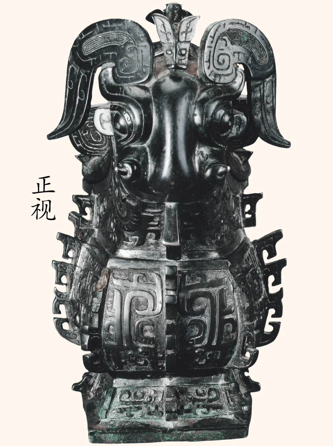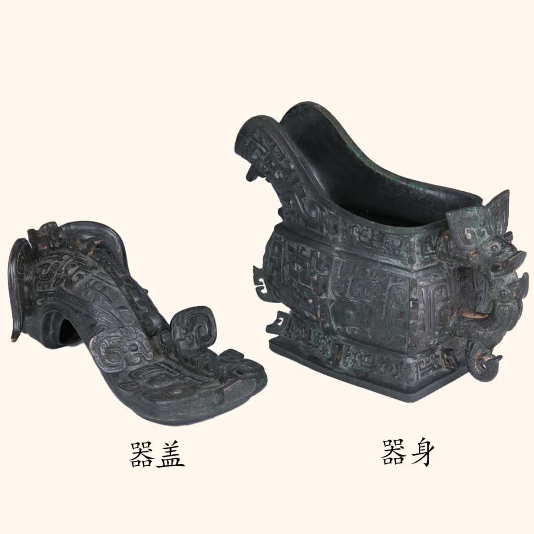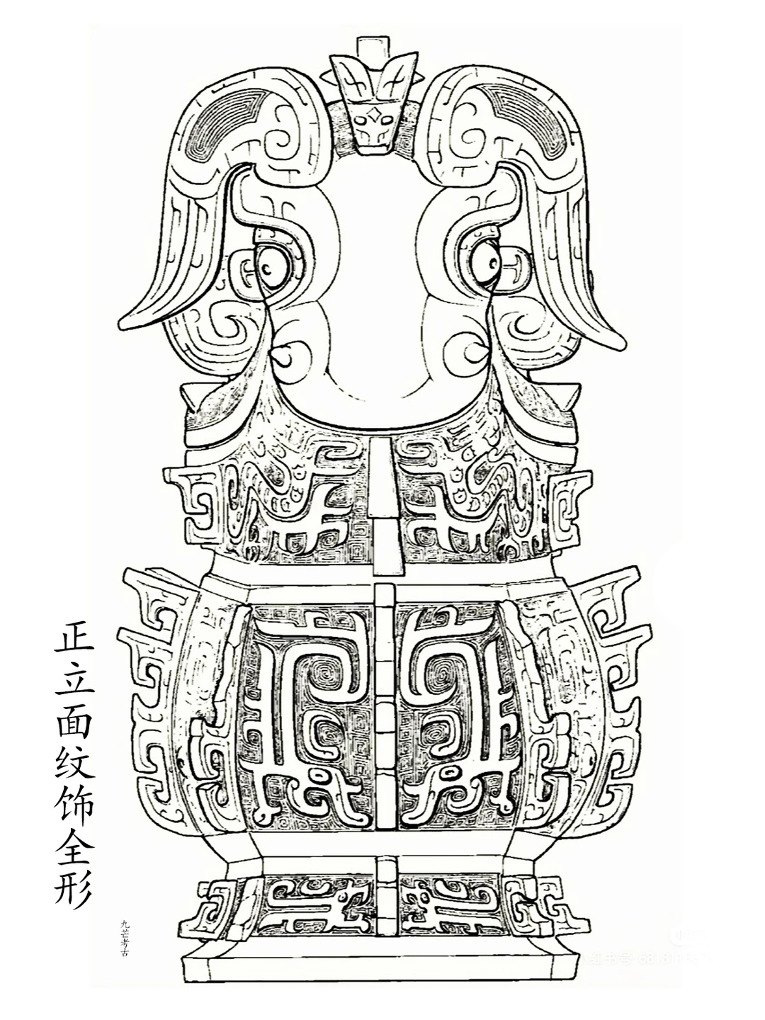 整器满花浮雕,立体感较强。盖首端为一兽首面,圆雕羊角向下弯曲,,上饰阴线纹;高鼻鼓目,两齿外露,两角之间置一圆雕龙首,从龙首处开始,在盖脊正中延伸一条扉棱,饰为龙身,直到盖身后部饰圆雕向上卷曲龙尾:盖身饰二组大回首夔龙纹,以扉脊为界。盖尾部亦饰一饕餮纹雕饰,圆雕兽角内卷曲,角面饰两对视的卷鼻卷尾夔龙纹,饕餮圆面,叶形耳,粗眉圆目,嘴角内卷,鼻前端向前凸起;盖尾部出圆雕兽尾示器盖部兽尾。器身扉棱将纹饰分为四个部分,颈部饰一大回首夔龙纹,扉棱后饰一小回首夔龙纹,腹部前后两面各饰竖体夔龙纹,前部以扉棱为界,后部有鋬,以阴线刻蝉纹为界;器身两侧面各饰一组大饕餮纹,以扉棱为界;圈足上饰四组两两相对的回首卷尾夔纹,圈足侧面两组夔纹较长,前后面两组夔纹较短。整器以雷纹衬地。