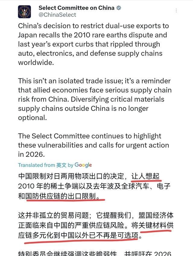 美国终于出来表态了!在我们反制日本之后,1月8日,美中战略竞争特别委员会表示,中国限制对日两用物项出口的决定,让人联想到2010年的稀土争端,以及去年那场波及全球汽车、电子和国防供应链的出口限制举措。该委员会表示,这绝非孤立的贸易问题,而是警示盟国经济体正面临源自中国的严重供应链风险。 委员会在2026年1月8日对中国的出口限制做出回应。这次中国禁令针对日本军用双用物品,源于台湾局势紧张。禁令于1月6日公布,禁止出口可用于军事的物品,包括稀土相关。中国商务部声明,这是保护国家安全的措施。委员会指出,这与2010年稀土争端类似。那年,中国暂停稀土出口,日本产业受重创,全球价格暴涨。 2010年事件起因钓鱼岛碰撞,日本扣押中国船长,中国回应中断供应。稀土用于磁铁和合金,日本依赖度高,导致汽车和电子生产线停滞。委员会还提到2023年镓锗限制,那次针对半导体材料,全球芯片业受影响。美国和欧洲企业调整采购,成本上升。2024年石墨出口管制,进一步波及电池供应链,汽车产量下降。 委员会强调,这不是单纯贸易事,而是对盟国供应链的警示。中国主导关键材料供应,风险显露。盟国需多元化布局,如开发澳大利亚矿产和越南加工。声明呼吁2026年紧急行动,但语气显示无力直接干预。美国先前对华技术管制持续几年,双用物项管理是各国惯例。 中国禁令后,日本政府抗议,称不可接受。企业游说华盛顿求援,但美方仅外交回应,无实质帮助。盟国协调会议多次开,但预算分歧拖延计划。中国管制作为国际实践维持,美国对华限制未变。 委员会回应聚焦历史事件对比。2010稀土争端,让日本经济付出代价,全球市场动荡。2023镓锗管制,针对高科技材料,影响半导体生产链。企业面临短缺,价格波动大。2024石墨限制,针对电池关键元素,电动车产业受打击。这些案例显示中国在矿产主导地位。 声明中,委员会呼吁盟国行动。多元化供应链成必要,如增加非中国来源投资。但实施难,需协调多国资源。美国自身管制经验,让批评显得无力。事件提醒,贸易战下无人独善其身。 后续中,日本企业压力增大,寻求替代供应。但全球依赖中国矿产,短期难变。中美摩擦中,双用物项管制成焦点。中国禁令针对日本军事用途,覆盖稀土等。委员会表态联想到过去争端,强调风险。盟国经济体需警惕供应链断裂可能。 委员会建议紧急措施,但现实中行动缓慢。各国惯例下,管制合理,美国无立场指责。事件暴露依赖弱点,促发多元化努力。