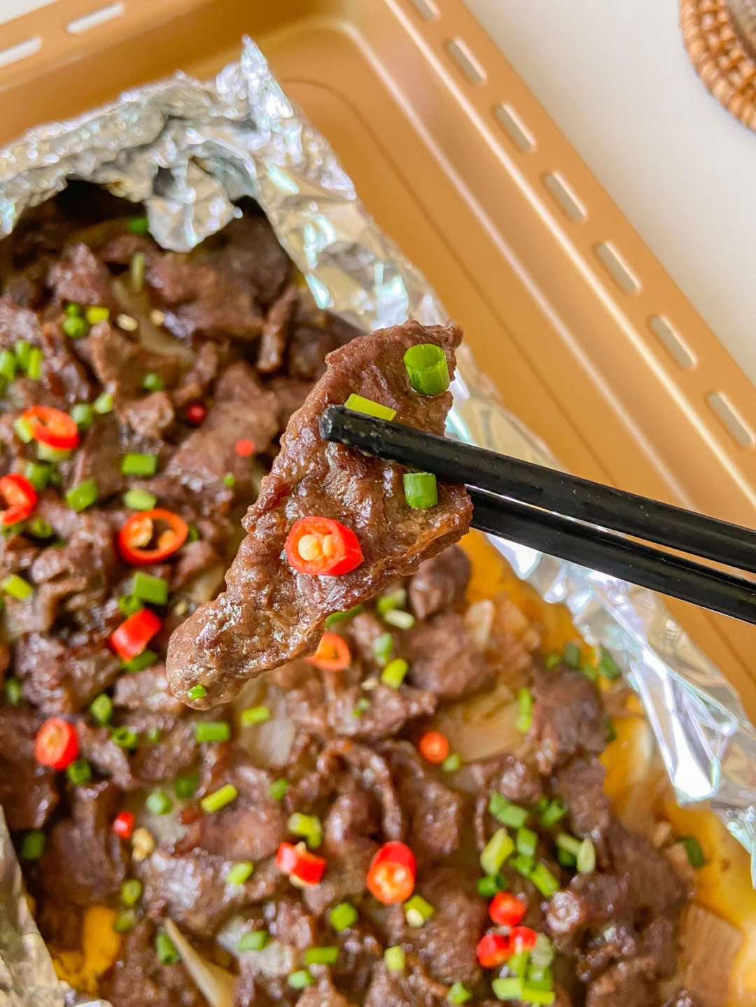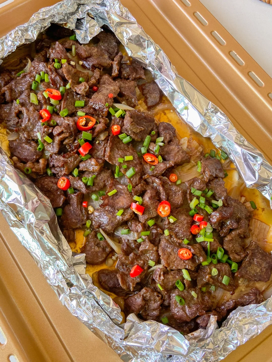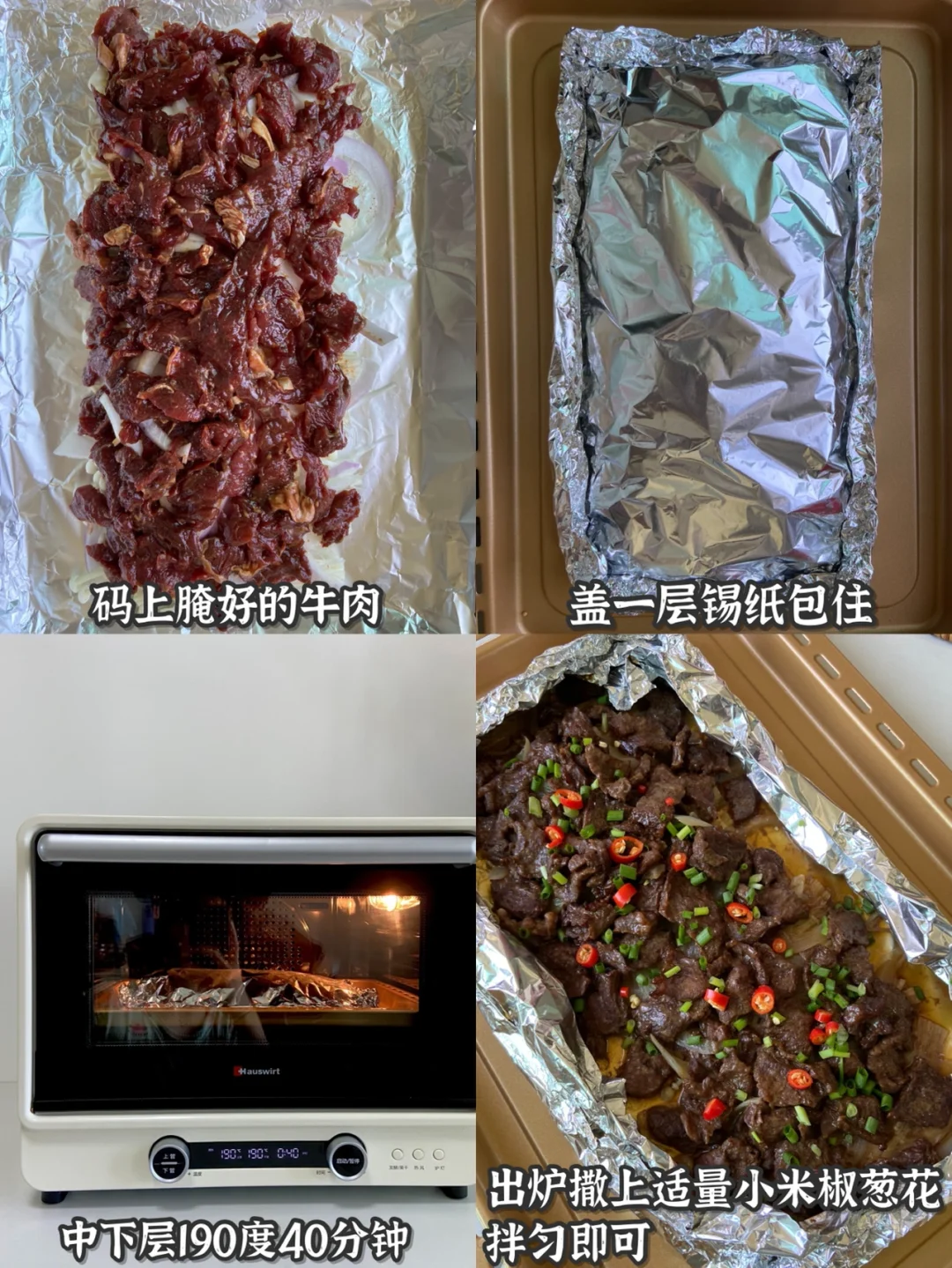 2️⃣烤箱190度预热 烤盘里面垫锡纸 放入金撒上点辣椒粉洋葱丝(洋葱偏甜 不喜甜的少放一点)再码上腌好的牛肉 盖一层锡纸包住 中下层190度40分钟