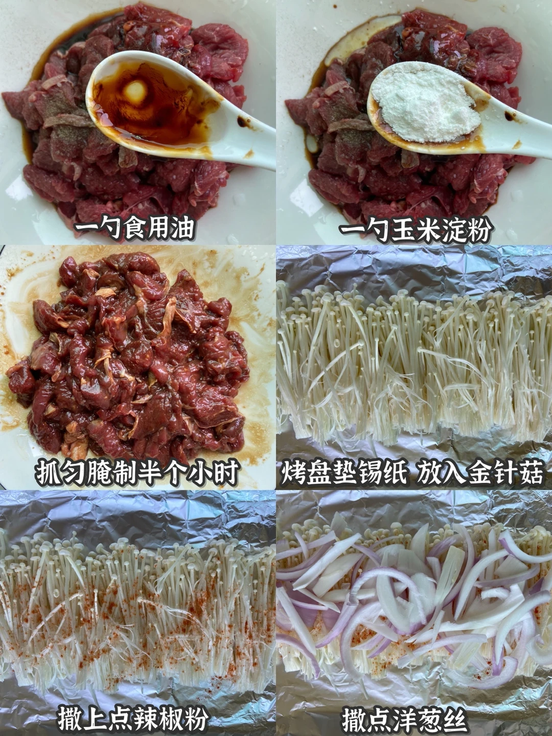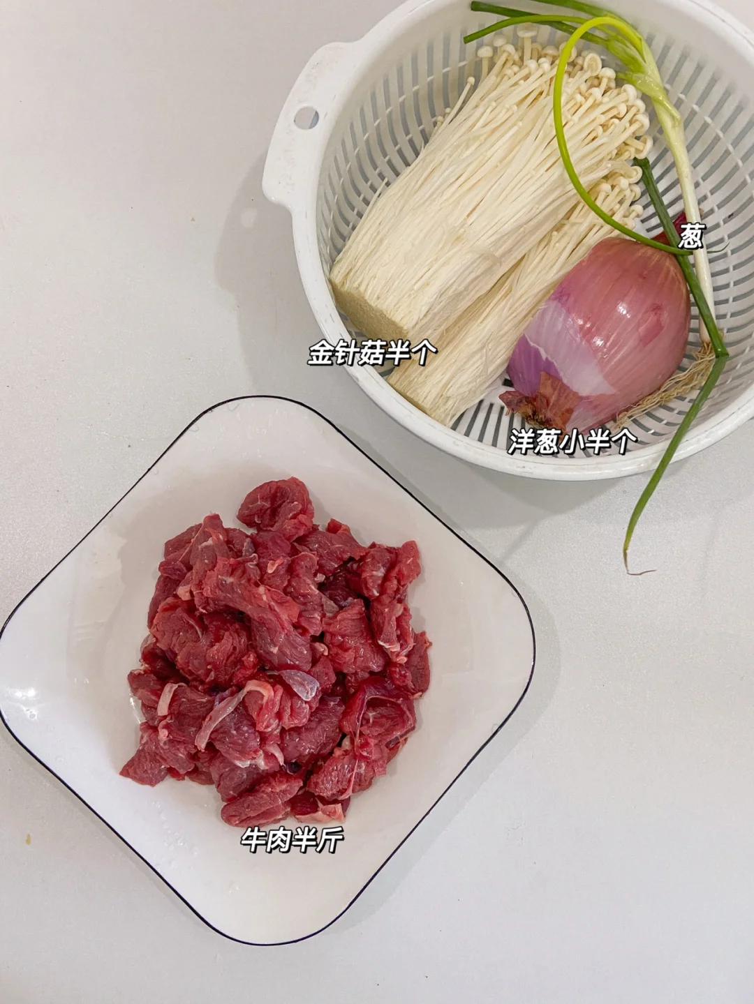 1️⃣牛肉切片 洋葱切丝 金针菇去根洗净