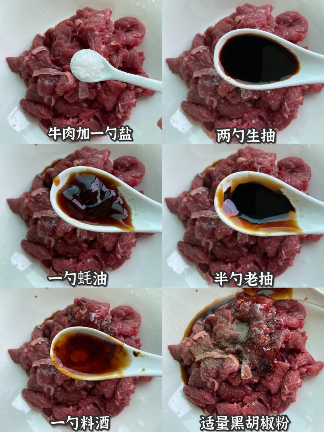 2️⃣牛肉➕一勺盐➕ 两勺生抽➕一勺蚝油➕半勺老抽➕一勺料酒➕适量黑胡椒粉➕一勺食用油➕一勺淀粉抓均匀腌制30分钟