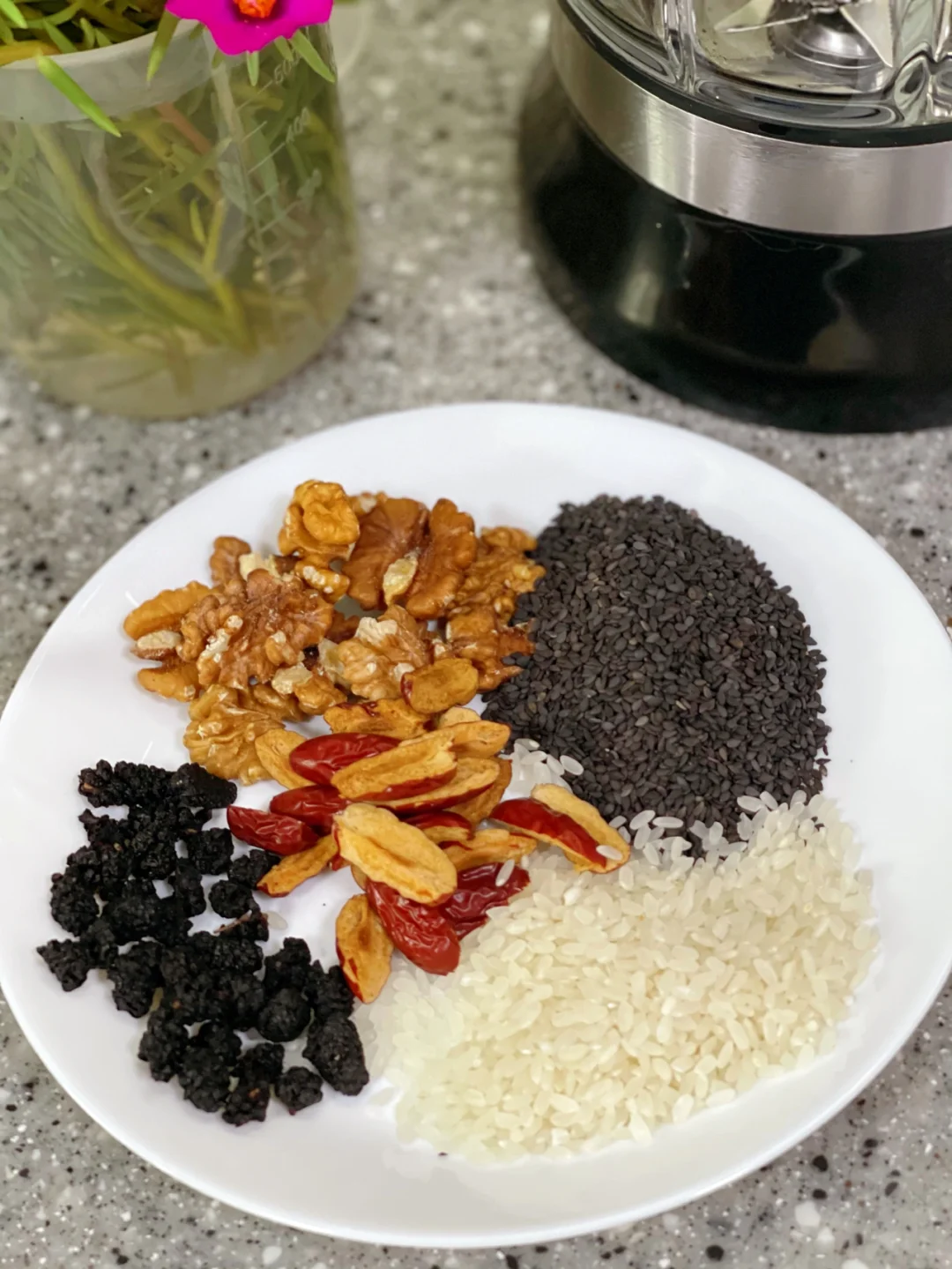 材料:黑芝麻25g,核桃30g,大米25g,红枣三个,桑葚一小把【冰糖可以不放哦,家里有黑豆的也可以放一点】