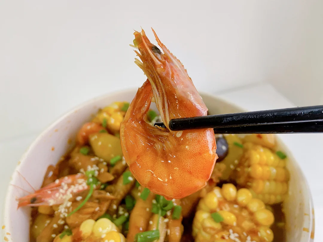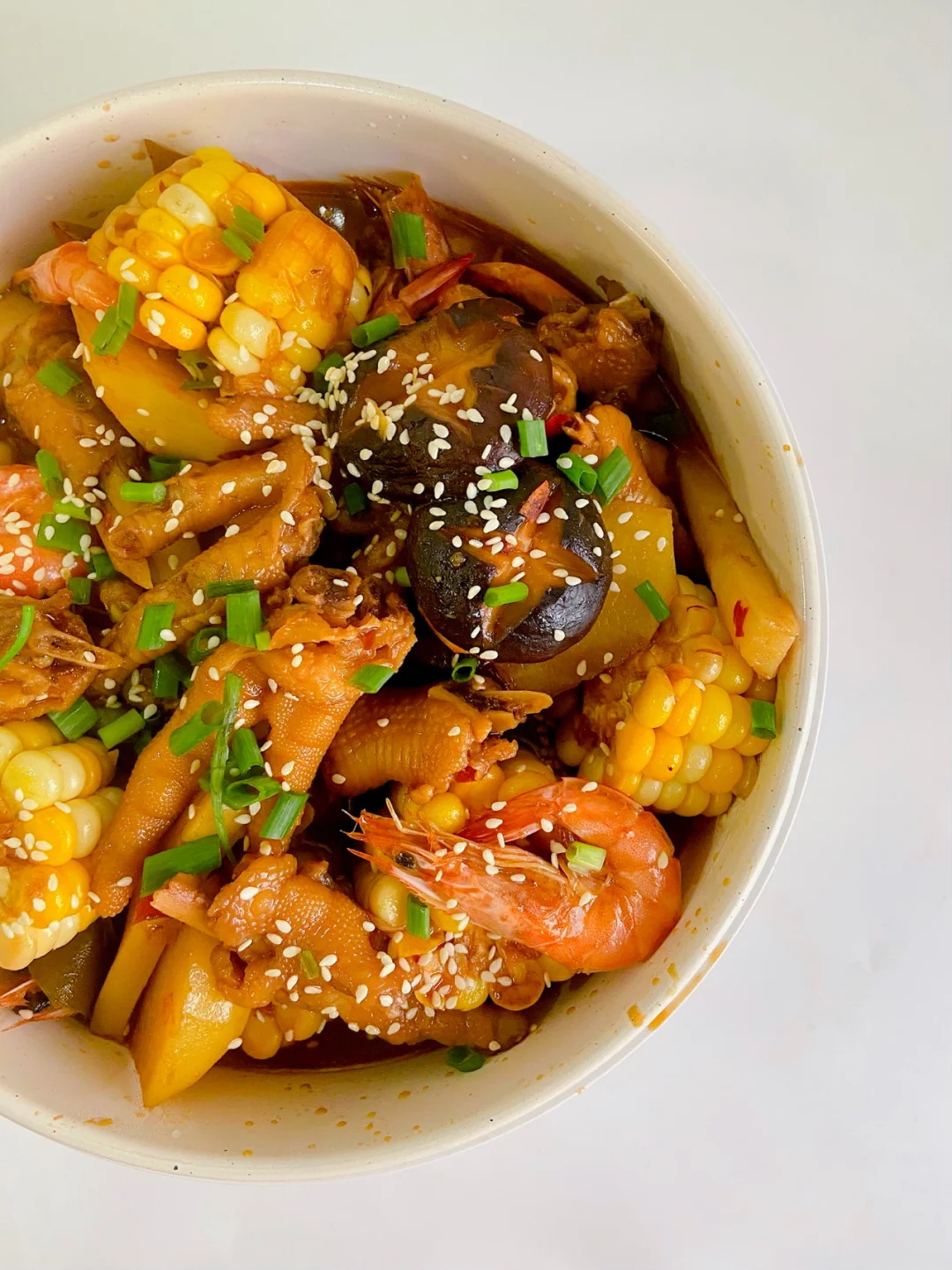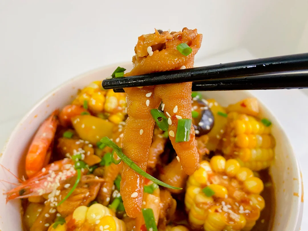 鸡爪 虾 土豆一个 年糕 香菇 玉米 啤酒一罐