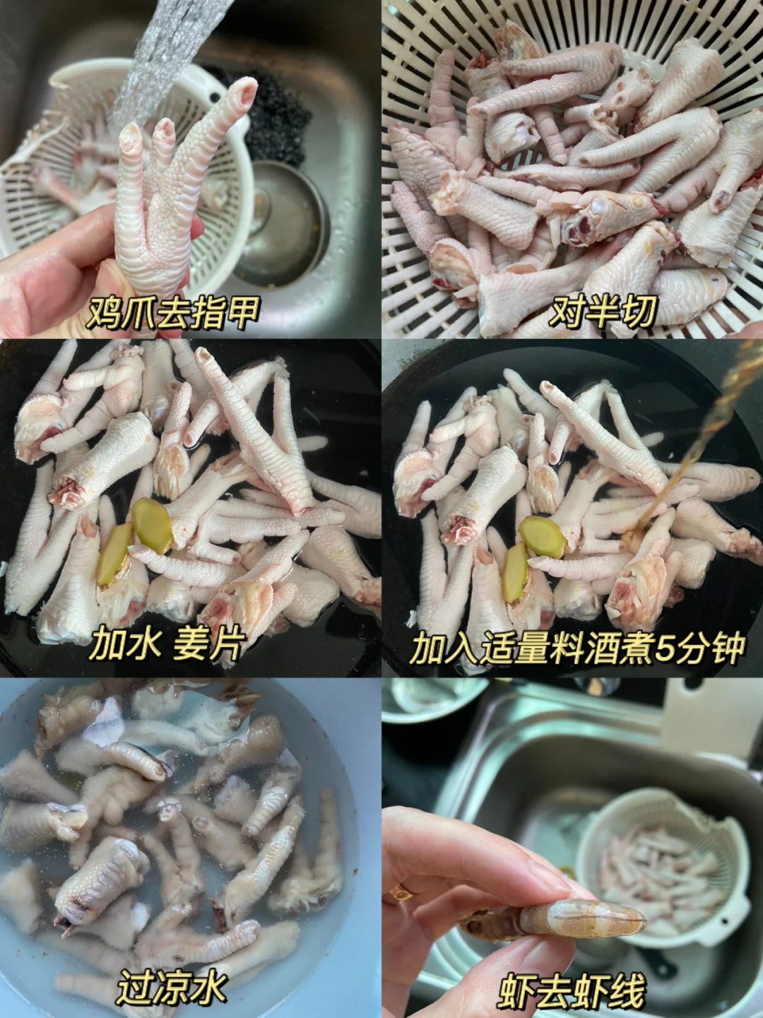 1️⃣鸡爪去指甲对半切 虾去虾线