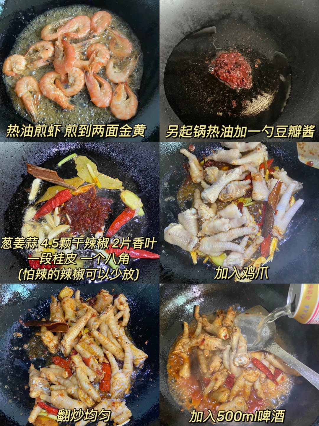 4️⃣新锅热油加一勺豆瓣酱 葱姜蒜 4.5颗干辣椒 2片香叶 一段桂皮 一个八角 放入鸡爪 鸡爪翻炒上色