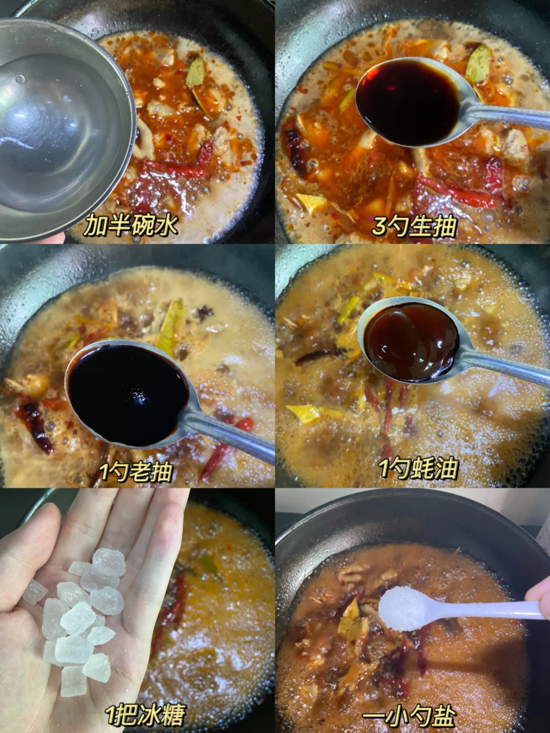 5️⃣加入500ml啤酒 半碗清水 3勺生抽 1勺老抽 1勺蚝油 1把冰糖 半勺盐小火炖20分钟