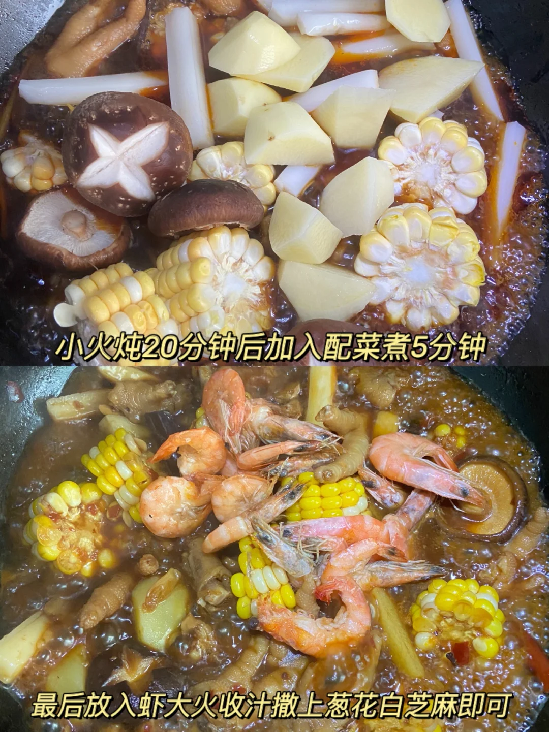 6️⃣加入配菜 土豆年糕继续炖5分钟 加入煎好的虾大火收汁撒上白芝麻 葱花即可