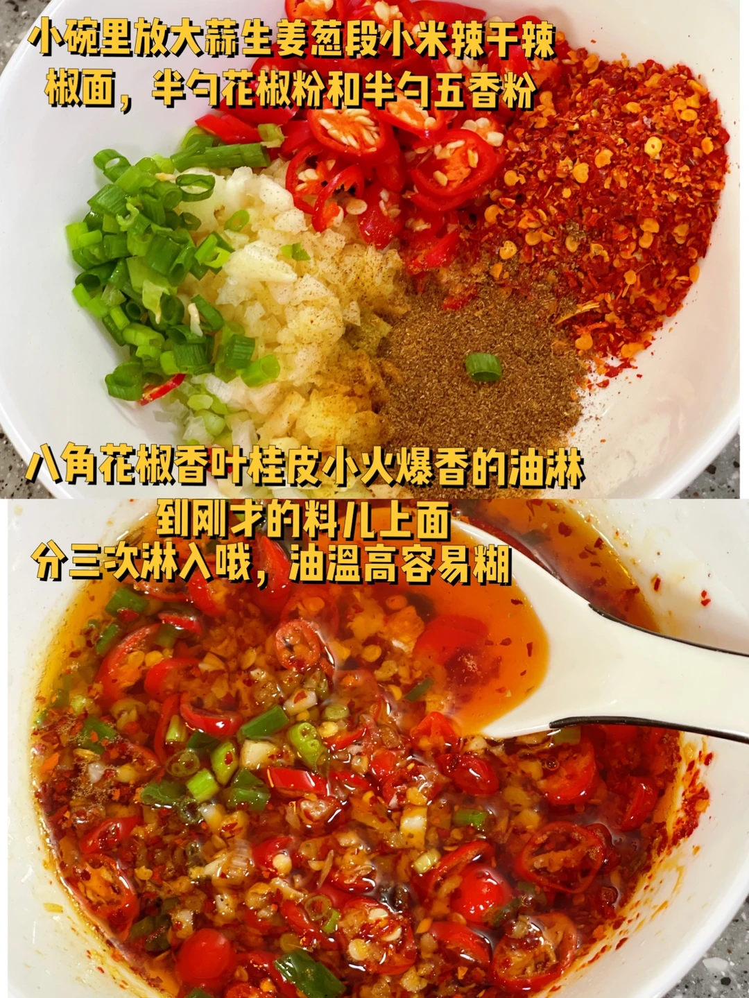 2. 八角花椒香叶桂皮小火爆香的油淋到刚才的料儿上面,分三次淋入哦,油温高容易糊