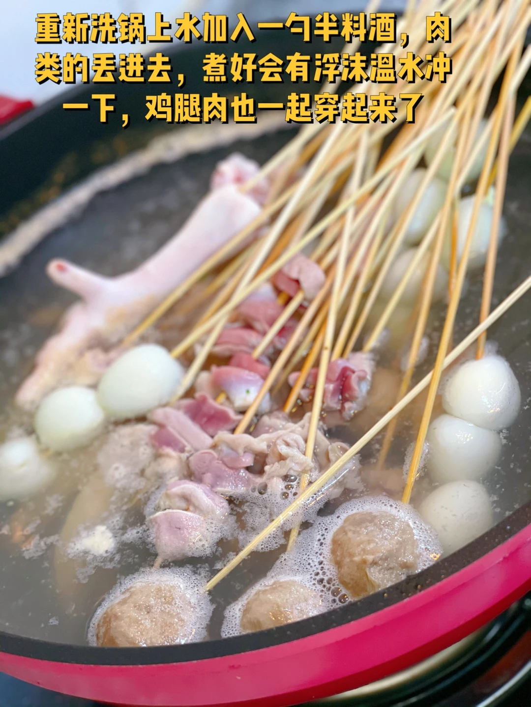 7. 重新洗锅上水加入一勺半料酒,肉类的丢进去,煮好会有浮沫温水冲一下,鸡腿肉也一起穿起来了