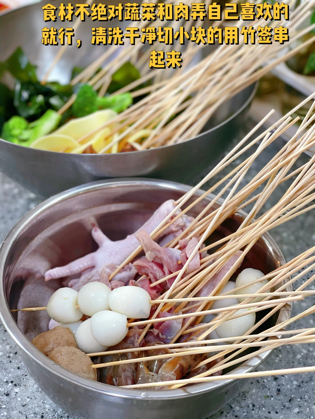 4. 食材不绝对蔬菜和肉弄自己喜欢的就行,清洗干净切小块的用竹签串起来