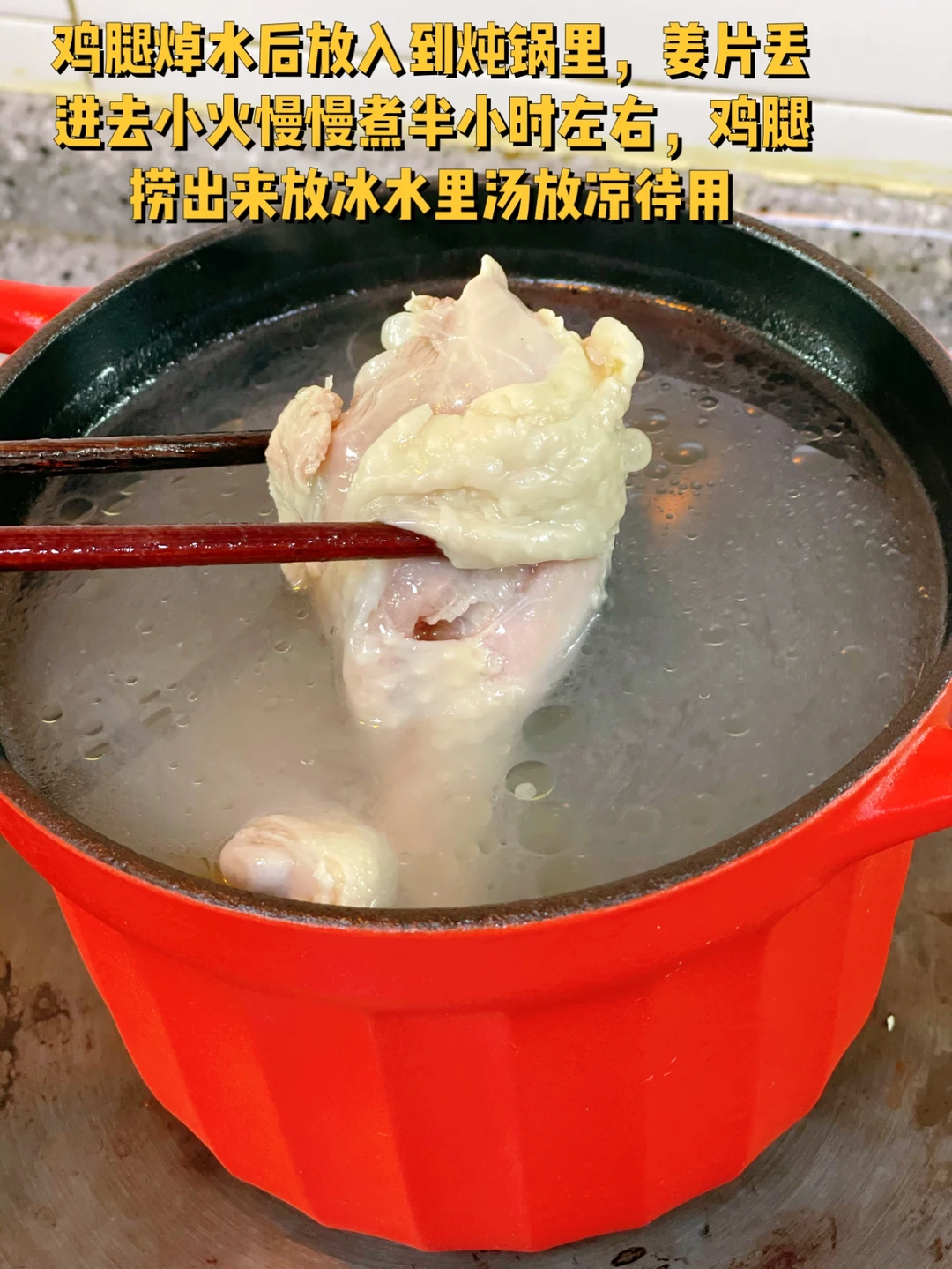 3.鸡腿焯水后放入到炖锅里,姜片丢进去小火慢慢煮半小时左右,鸡腿捞出来放冰水里汤放凉待用