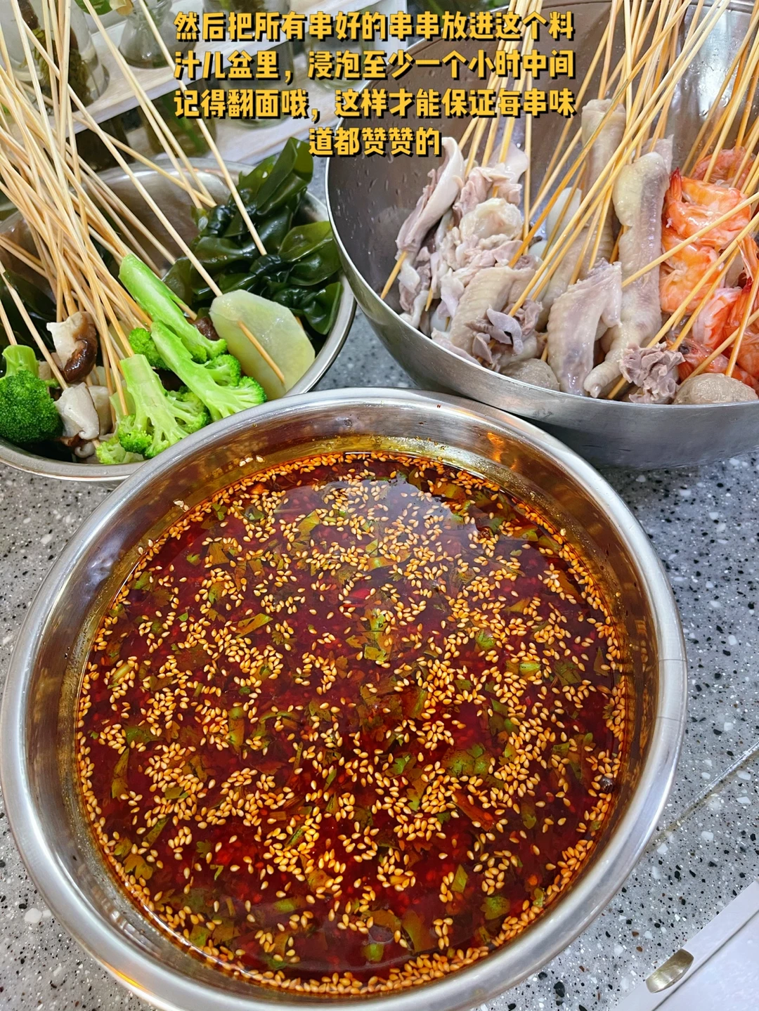 9. 然后把所有串好的串串放进这个料汁儿盆里,浸泡至少一个小时中间记得翻面哦,这样才能保证每串味道都赞赞的