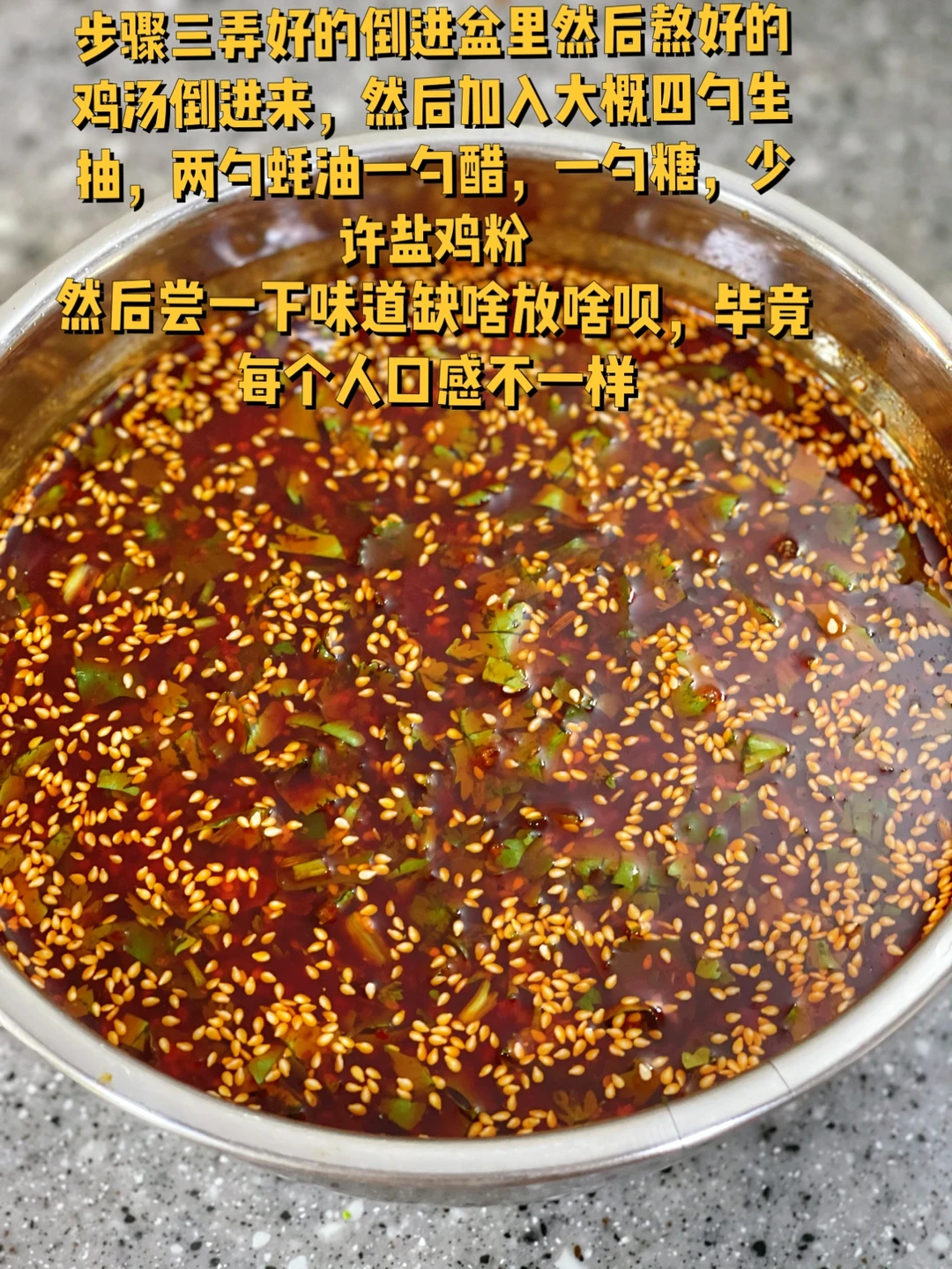 8. 步骤三弄好的倒进盆里然后熬好的鸡汤倒进来,然后加入大概四勺生抽,两勺蚝油一勺醋,一勺糖,少许盐鸡粉