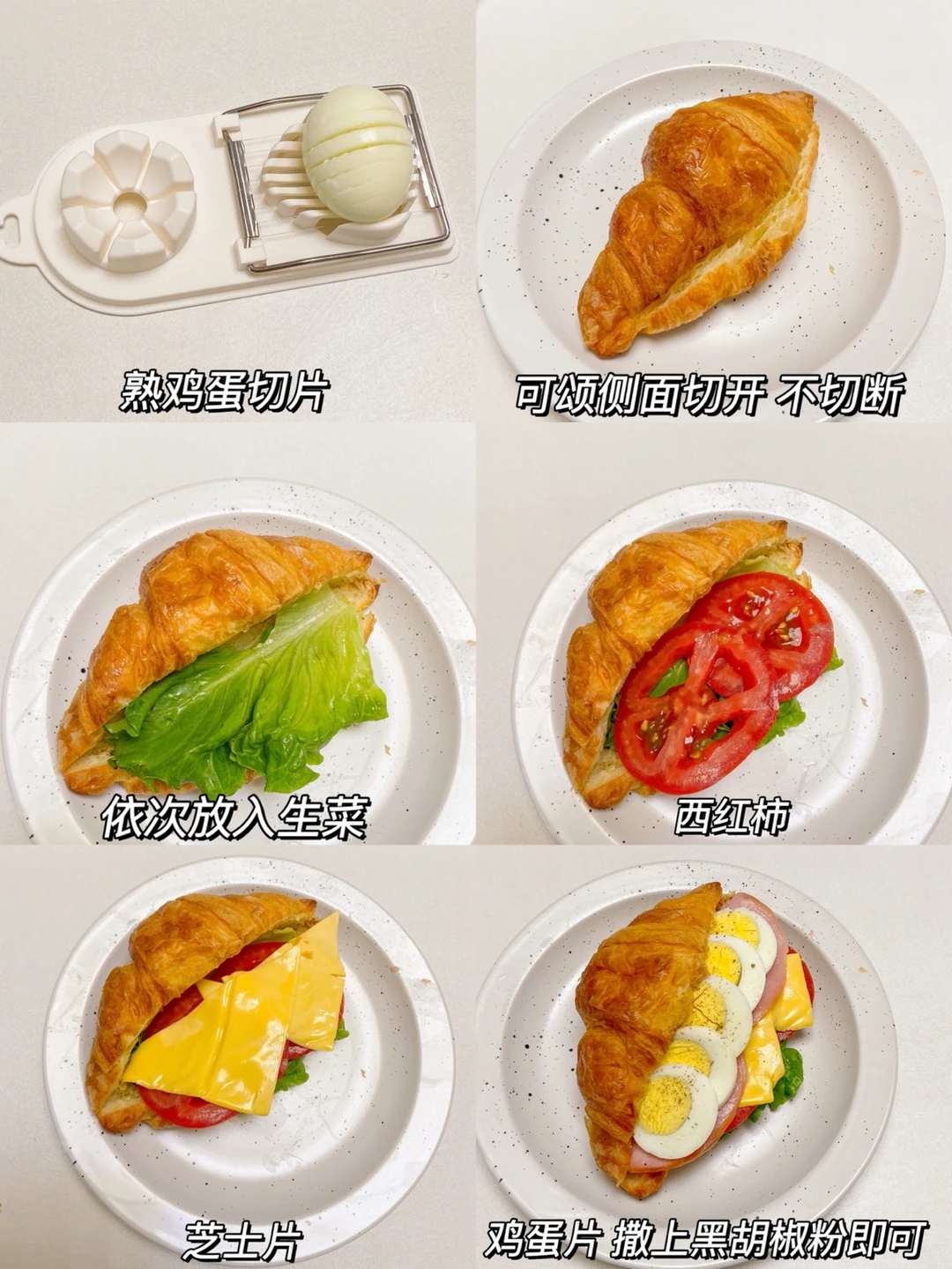 3️⃣可颂依次放入生菜➕西红柿片➕芝士➕香肠片➕鸡蛋即可✔️